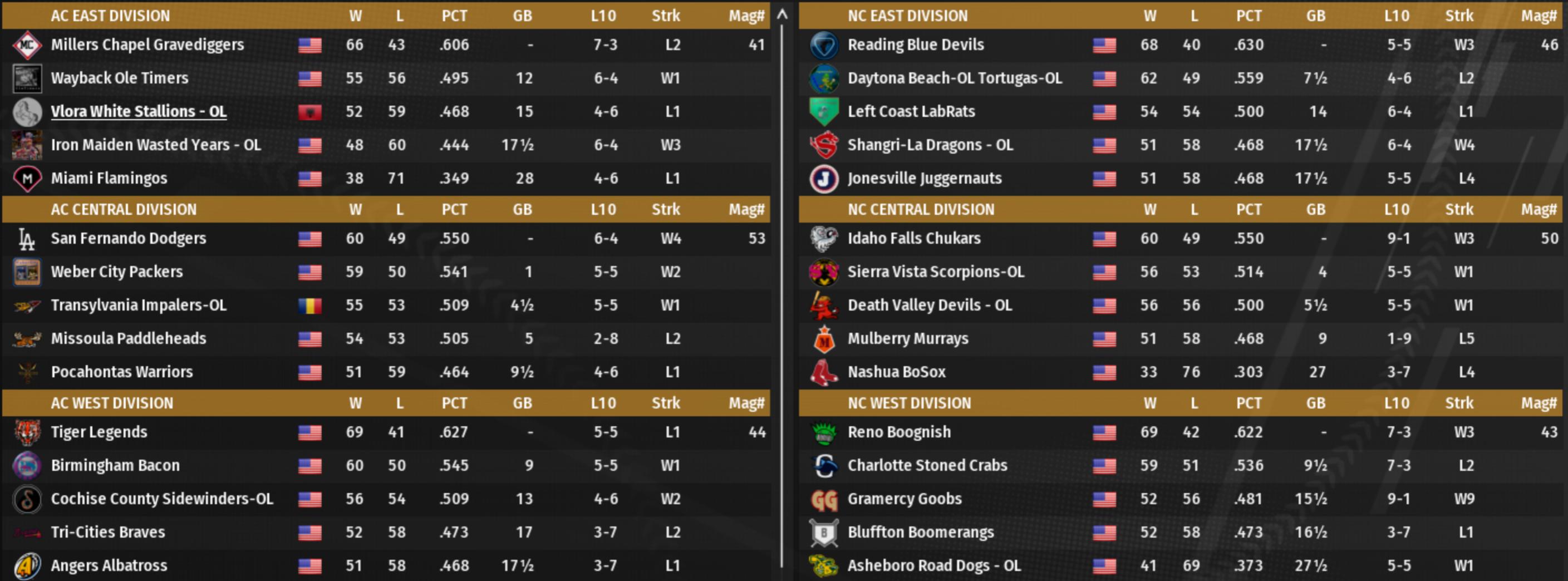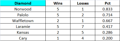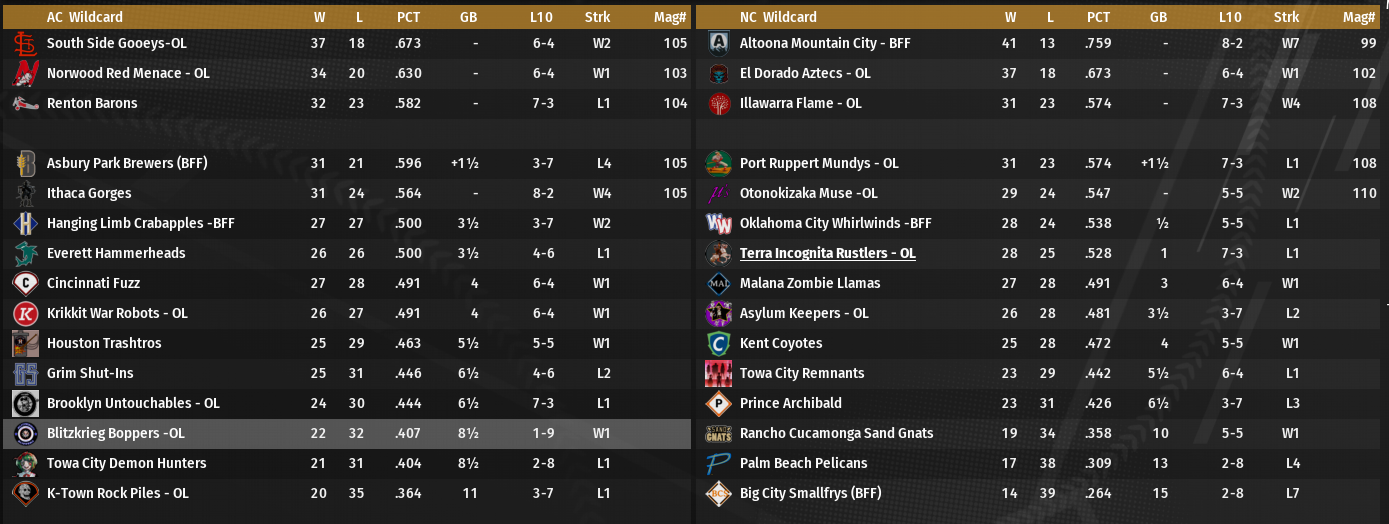 Norwood claims the Diamond tier crown as Palolo stumbles in September with a 5-5 mark. Overall, three OL teams in the playoffs with Norwood and Palolo snagging division crowns, and Laramie picking up a wild card. relegations to Gold: Kansas Rangers and for the "celebrate the little victories" category, for the first time in v21, Waffletown finished over .500 at the Diamond tier (82-80) and did not get relegated after one season