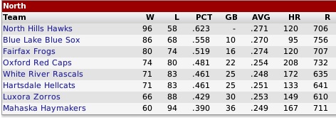 Tuesday, September 23, 2036 NH HAWKS WIN 3RD STRAIGHT TU NORTH FLAG Winning the Tycobbian North came tough in 2034 and 2035 for the North Hills Hawks... they took the titles by two games and one game... but this year the Hawks soared out to a 6-game lead at the All-Star Game and never were challenged... they won in a romp by 10 games over runner-up Blue Lake... North Hills was ranked first in The Islandian Times preseason poll with a tight race with Luxora chosen second and Blue Lake predicted third... third place went to the Fairfax Frogs, who were 16 games off the pace... only the three top clubs finished with winning records... in fourth place were the Oxford Red Caps, trailing by 22 games. White River and Hartsdale deadlocked for fifth place 25 games back... seventh went Luxora, 30 games out in the race... and last place went to the Mahaska Haymakers, 36 games behind. 1st - North Hills: also won pennants in 2034 and 2035... and for the first time in the team's history took the IPA Pro Cup in 2034... the Hawks are a better team this year and should be a threat to win the coveted Pro Cup... they have outstanding pitching with a 3.11 team ERA (1st) and strong defense with a .979 FA, coupled with adequate offense... the Hawks hit .271 (6th), scored 706 runs (14th), but lack power... they hit only 120 HRs (28th-tied)... this will be North Hills' fifth appearance in the postseason. Top Performers: Frankie Lambert (18-8/2.85), All-Star Jeff Owens (23-12/2.99), Nelson Hooper (21-7/3.06), David Michael (20-18/3.42), All-Star LF Adam Thurgood (.341/32/127/75), RF Gerry Rice (.336/3/44/61), 3B Tommy Vavas (.297/9/43/88) 2nd - Blue Lake: rose up from cellar last year (19.5 GB)... the Blue Sox had been no better than seventh or eighth since 2032... they have made the playoffs only 3 times previously with one Pro Cup taken in 2030... Blue Lake has solid offense, pitching and fielding... they batted .270 (8th), tied for sixth in scoring (756 runs), posted a 3.62 ERA (7th) and fielded at the rate of .976... but the Blue Sox do have weaknesses at the plate (95 HR-32nd) and in the bullpen (4.58 ERA-31st) Top Performers: All-Star Frankie Quinn (21-12/2.84), Sal Mays (20-11/3.62), Andre Montrose (19-14/3.39), CF Raddy Pajak (.309/12/79/98), LF Jack Ryan (.305/10/88/96), 1B Elton Graff (.310/8/51/64), SS Joe Korman (.286/11/80/105) 3rd - Fairfax: made first division for eighth year in a row... ended up 16 games behind North Hills... last year lost a one-game playoff to North Hills... never won a Pro Cup, but has made the playoffs on eight occasions... last won TU North in 2032 and 2033... good pitching with a 3.56 ERA (5th)... fairly good offense with .274 BA (5th), 707 runs (13th), but only fair firepower with 128 HRs (28th-tied)... top-notch defense with .978 FA Top Performers: Harold Dorman (18-11/2.58), Lucien Vachon (16-14/3.58), who was gotten from Elnora in an off-season trade, Bruno Stratton (4-6/2.34/22 saves), All-Star SS John Velasco (.301/20/88/81), 1B Leonard Crawford (.331/4/69/83), RF Roger Krieger (.313/19/85/72), LF Sonny Oliver (.308/22/82/64), who was obtained in late July in a trade with Colchester, All-Star C Jaak Pajukivi (.262/13/65/55), who was traded to Elnora at deadline 4th - Oxford: 22 GB... up from seventh last season 16.5 GB... no postseason since 2007, when the Red Caps won their only Pro Cup... they have made the playoffs five times... good HR power with 208 (2nd-tied), pretty good offense with 732 runs (9th), average hitting (.254 BA/19th)... good defense with .976 FA... not much on the mound with a 4.34 team ERA (28th) Top Performers: Tommy Ellefsen (8-3/2.90), RF Crusher Derringer (.309/18/62.59), LF Dennis Hartwig (.297/16/48/75), 2B Alonzo Norris (.250/26/87/86)... CF Dalton Ward led with 30 homers, but hit only .212 for average... 1B Kerry Sterling had 21 roundtrippers and 73 RBIs, but batted only .245... 3B Boyd Olsen has 20 home runs with a .274 BA 5th tied - White River: 25 GB... also fifth last season 11.5 GB... no Pro Cups... Rascals have picked up 4 pennants... 2027 was the last postseason appearance... mediocre on the mound (4.00 ERA- 20th), terrible bullpen (4.39/29th) and under average at the plate (.248 BA-29th)... just average defensively (.972 FA)... fairly good power with 172 HRs (12th)... poor scoring with 635 runs (31st) Top Performers: Kenny Nikas (19-17/2.81), CF Buford Cross (.301/20/62/97), C Stevie Dee Daniels (.237/31/100/57), 1B Davey Sloan (.278/25/81/65) 5th tied - Hartsdale: 25 GB... was in sixth place (12.5 GB) in 2035... been in the playoffs 6 times... most recently in 2029... no Pro Cups in its history... basically just a second-division club with .251 BA (25th), 641 runs (29th), 133 HRs (26th), 4.10 ERA (24th) and a little above average in the field with a .974 FA Top Performers: Larry Urban (17-11/3.88), 1B Hayden Richardson (.293/26/66/84), SS Jesse Jenkins (.290/9/44//78) 7th - Luxora: 30 games behind winning North Hills... down from third just 6.5 games out in 2035... 11 playoff appearances in history, but no Pro Cups to show for them... last postseason was in 2031... impressive pitching with a 3.26 ERA... very poor scoring runs (610 runs-32nd)... fair power with 149 HRs (21st)... slack on defense with .970 FA Top Performers: Jake Weiland (19-16/2.50), Kent Halloran (13-15/2.54), Benny DeVito (15-21/2.91), All-Star 3B Toddy Dubbins (.311/25/78/56), SS Kelvin Cassidy (.277/19/67/60), LF Larry Collins (.310/14/47/57), 1B Gerry Hathaway (.276/21/62/72) 8th - Mahaska: 36 GB... dropped from fourth place last year (9.5 GB)... in playoffs only 4 times... no Pro Cups... last postseason was in 2028... pretty much second-division team the last eight seasons... bad on the hill with 4.34 ERA (29th)... weak hitting with a .249 BA (27th), but has decent power with 167 HRs (15th) and 711 runs (12th)... absolutely horrendous on defense with a .958 FA, probably the worst fielding team in IPA history Top Performers: rookie Kirk Stanley (7-6/2.74/14 sav