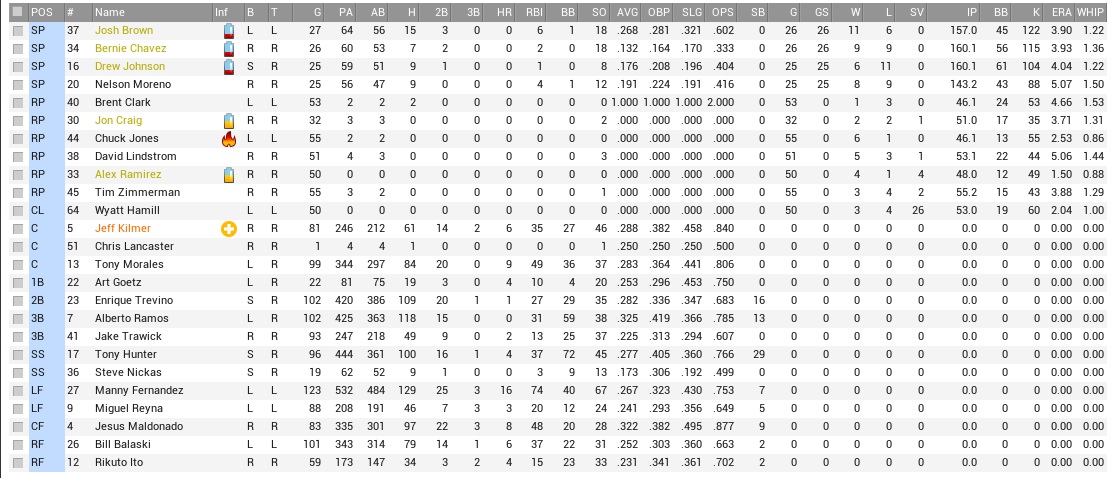 +++ Roster moves When the Raccoons left down, not all of the litter managed to join: Dr. Padilla diagnosed Nick Lando with a broken claw and he was assigned to the DL instead. He’d be out for about six weeks. The other departure was Doug Levis (.231, 13 HR, 52 RBI), who was traded to the Warriors with single-A INF/LF Andy Benton for right-hander Jon Craig (1-2, 3.57 ERA, 1 SV), who could be used as a starter, but was better employed in relief. In a different deal, the Raccoons picked up an offer by the Gold Sox on a busy Monday and took on right-hander Terry Garrigan (1-1, 6.57 ERA) in exchange for AAA 2B Jose Brito. The 27-year-old Brito was a .301 hitter in the majors, much better in a way smaller sample size than his AAA track record. Garrigan had been a fairly steady Knights starter in the mid-30s, but had come apart recently and was a free agent after the season should we tire of him quickly. To make numbers add up, the Raccoons sent Josh Rella (7.71 ERA) back to the Alley Cats while adding both Garrigan and Craig to the roster. We also added 1B Art Goetz to play first base full-time. Goetz had batted 3-for-9 with a homer in his brief cameo earlier this year. We thus carried an extra pitcher as the week began, but the trade deadline was near, so who knows?