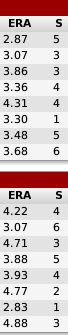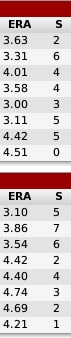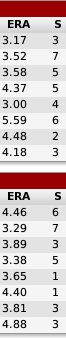 White River (11-13) is tied for seventh place this season with Luxora and forecast to be fifth in the preseason poll... since coming in a close second to North Hills in 2034, the Rascals have trended downward, winding up fifth those two seasons... they have good pitching with a 3.48 ERA (11th), but can't hit a lick (.224 BA/31st) except for CF Buford Cross (.325), 2B Quincy Shanahan (.303) and RF Zachary Kriger (.293)... veteran C Stevie Dee Daniels is the only power guy with 7 homers and 16 RBIs, but he is hitting only .232... heading up a fine starting rotation are vets Kenny Nikas (2-3/2.54) and Paul Sardini (2-2/3.71), both 34 years old... Sardini is 207-174 with a terrific lifetime 2.88 ERA, while Nikas is 137-106 with a superlative 2.60 career ERA... rounding out the rotation are youngsters Mickey Cronyn (1-2/3.86) and J. C. Hudson (2-2/3.33)... Cronyn is the son of Rascal manager Mick Cronyn, who toiled long and hard for 15 seasons in White River from 2003 to 2017... he posted a 196-201 record with a 3.73 ERA... the Rascals were a pathetic team during most of those years... they never made the playoffs.