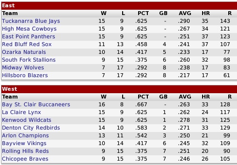 One month into the 2037 season there is a three-way tie for the top spot in the Tycobbian East Division featuring two bonifide contenders -the Tuckanarra Blue Jays and the East Point Panthers - and a possible flash-in-the-pan - the High Mesa Cowboys... only time will tell... Ozarka was made the favorite by THE ISLANDIAN TIMES preseason survey with perennial powerhouse Tuckanarra rated number two and East Point number three... to find High Mesa you had to go to the bottom of the list... the Cowboys were picked to end up in last place... the Red Bluff Red Sox are fourth in the standings, trailing by 4 games, while Ozarka has gotten off to a sluggish start and is in fifth place, 5 games out of first.