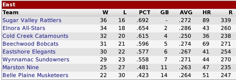There is quite a race going on in the Ruthlandian East, home of some of the best teams in the IPA... Sugar Valley surged to the top in May with a super 21-7 record... that gave the Rattlers a 2-game edge over the resurgence Elnora All-Stars... Cold Creek had a hot month, too, and is third place, 4 games out... Beechwood is fourth, 5 games behind... Eastshore is fifth, 6 games off the pace... and the April leader Wynnamac plunged to sixth with a 12-16 mark, falling 7 games back of Sugar Valley.
