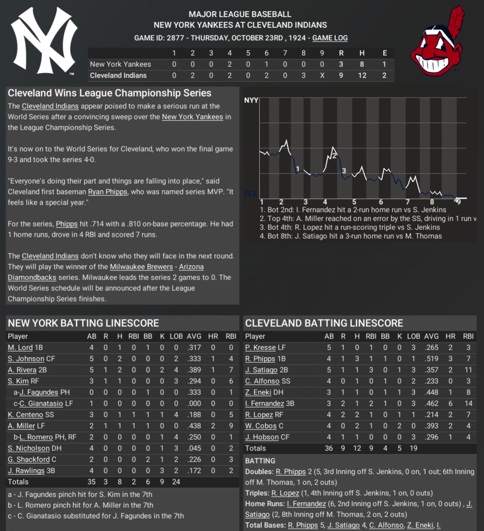 1919 1920 1923 1924 Mike: Chris, this wasn’t a series — this was a massacre! The Yankees came in as the number one seed in the American League, the big bad Bronx Bombers, and they got absolutely humiliated! Swept right outta the ballpark by Cleveland — 4 games to none! Mad Dog: EMBARRASSING, MIKE! EMBARRASSING! The Yankees should be ashamed of themselves! You win 100+ games, you’re the top seed, and you go out there and play like that? I mean, my goodness — they were never in it! Mike: Every single game, Cleveland came out swinging. They out-hit them, out-pitched them, out-hustled them — every category! Nine to three in the clincher! It wasn’t even close. Mad Dog: The Indians — FOUR pennants in six years, Mike! Four in six! And now they’re goin’ for their third World Series title in that span! That’s a dynasty, Mike! A DYNASTY! Mike: And how about Ryan Phipps, the series MVP — hitting .714, getting on base eight outta ten times, doubles, homers, you name it. The Yankees couldn’t retire him if they used a fishing net! Mad Dog: He was unbelievable! You could throw him a bowling ball, he’d hit it off the wall! Meanwhile, what do the Yankees got? Nothing! Rawlings can’t field, Nicholson can’t hit, the bullpen’s a disaster! Jenkins, Coffey, Thomas — a parade of mediocrity! Mike: And let’s be honest, Chris — this wasn’t even competitive. The Yankees were lucky to score three runs in that final game. Cleveland controlled it from the first inning on. Mad Dog: And Mike, let’s not forget — this is the same Cleveland team that spanked the Yankees last year in the ALCS! Four games to one! That’s eight wins to one over two postseasons! The Indians own them! Mike: They absolutely own them. The Yankees can’t solve this team. Fernandez, Satiago, Eneki — these guys are monsters. They just grind you down. Mad Dog: They don’t beat you — they bury you! They hit the ball hard, they run the bases, they play defense. The Yankees looked like they were waiting for the season to end! Mike: So now, Cleveland moves on to the World Series, waiting on the Milwaukee–Arizona winner. And Chris, whoever it is — they better bring their A-game, because right now, nobody’s hotter than Cleveland. Mad Dog: I’ll tell ya, Mike — they’re a machine. A freight train. You don’t wanna be standing on those tracks when they come through! Mike: No question. Yankees go home, Cleveland marches on. The road to a third championship goes right through Jacobs Field. Mad Dog: And the Yankees? They better do some soul-searching, Mike. Because this — this was ugly. |