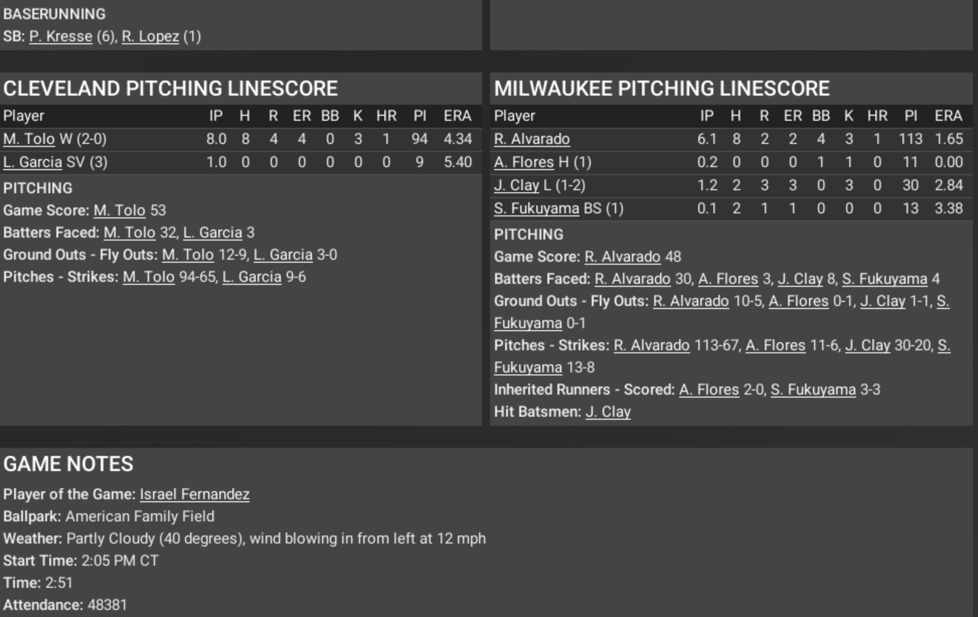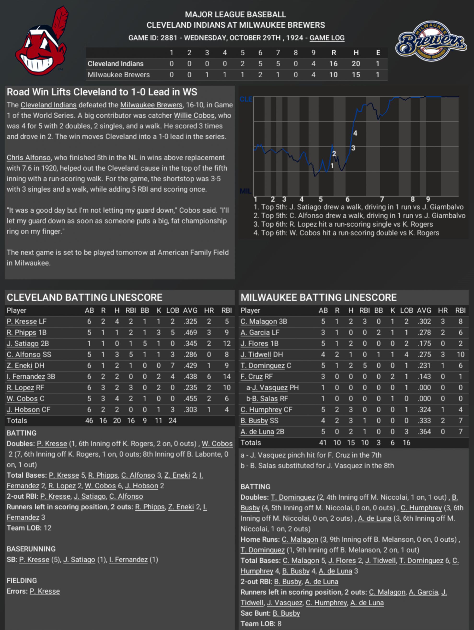 CLEVELAND INDIANS AT MILWAUKEE BREWERS October 30, 1924 – American Family Field, Milwaukee, WI “Well folks, the Indians have done it again! Cleveland takes Game 2 of the World Series, 6 to 4, and they now lead this thing two games to none. Somebody call the fire department, because Israel Fernandez is absolutely on fire! The man went 3-for-5, drove in three, and put this one to bed with a bases-clearing triple in the ninth. Indians win it, 6–4 — the Brew Crew left wondering what hit ‘em.” “Let’s rewind this one, shall we? Milwaukee had a 4–2 lead in the sixth after T. Dominguez’s solo blast and a few timely knocks, but you could just feel the tension building. Then, with two outs in the ninth, Fernandez strode up, bases loaded, and—BAM!—ripped one down the line for a triple. That’s three in the bank and Cleveland in the driver’s seat. They never looked back.” “And if you’re keeping score at home—and I know you are—R.l Lopez also went deep earlier, a two-run shot in the sixth that gave the Tribe some life. Pitcher Marco Tolo went eight gritty innings, gave up four runs, and probably aged five years in the process, but he gets the ‘W.’ Lupe Garcia shut the door in the ninth for the save.” “Meanwhile, the Brewers had their chances, but couldn’t cash in. Starter R. Alvarado pitched well enough to win, but the bullpen… let’s just say they’d rather forget that ninth inning. Tough day for the home crowd.” “So Cleveland heads back to Jacobs Field up two games to none, hotter than a sidewalk in July. The Brew Crew better find their mojo fast, or this series could be over quicker than you can say ‘wild thing!’” Player of the Game: Israel Fernandez — three hits, three RBIs, one big ol’ triple that broke Milwaukee’s heart. |