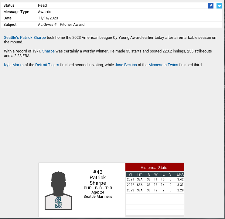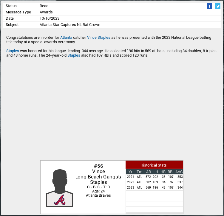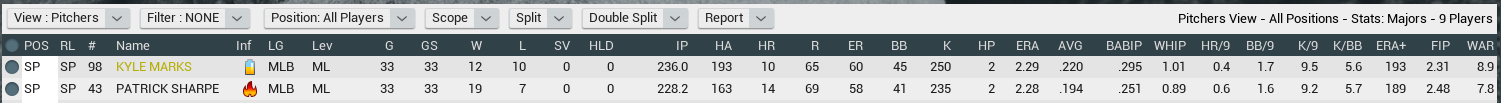 Notes: King's injury plagued season ends early due to a hammy. Marks tosses a No No against Seattle. Long and Keeran get POW awards. Sharpe gets POM. King has a setback. Staples wins NL batting crown. |