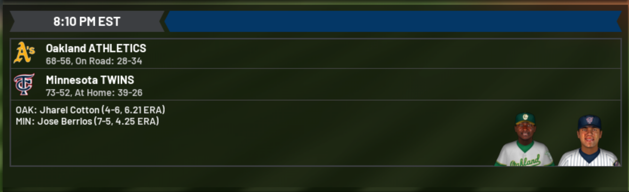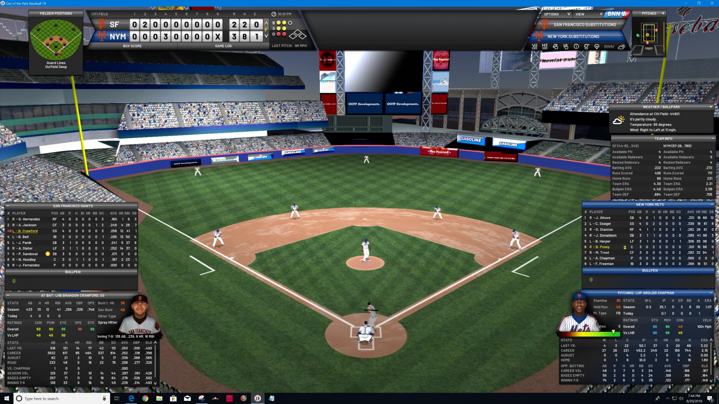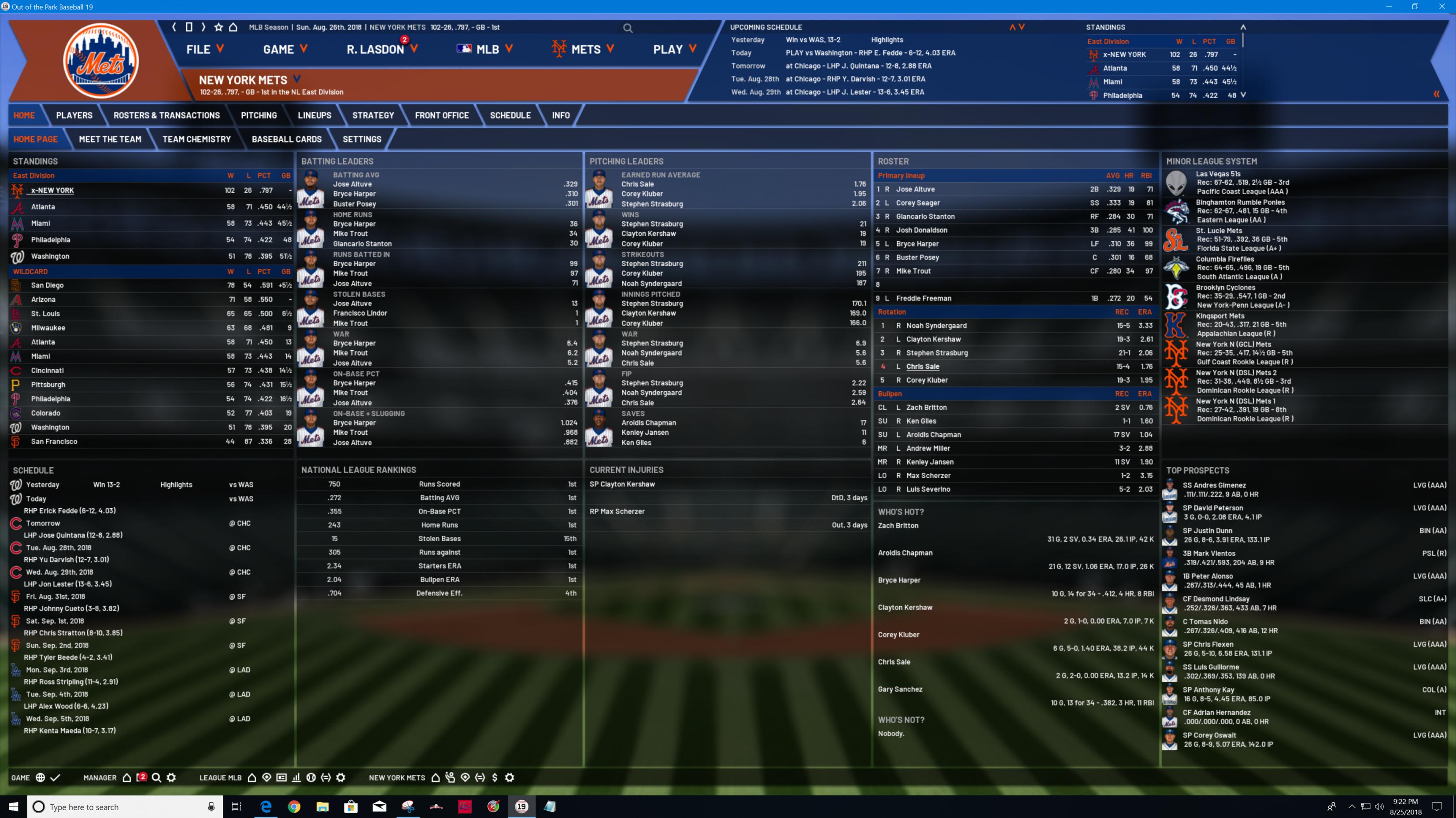 From one long 4-game series to another as the Giants come to town. This team knocked us out last year and now they come back to the place where they did it, on our home field. They are at the bottom of most stats in the NL, except for pitching. If you have MadBum, anything is possible. This is revenge for me and my Mets and I want to destroy the Giants in this series. Strasburg, Sale, Kluber and maybe Syndergaard will start these games versus last year's WS Champs in my season.