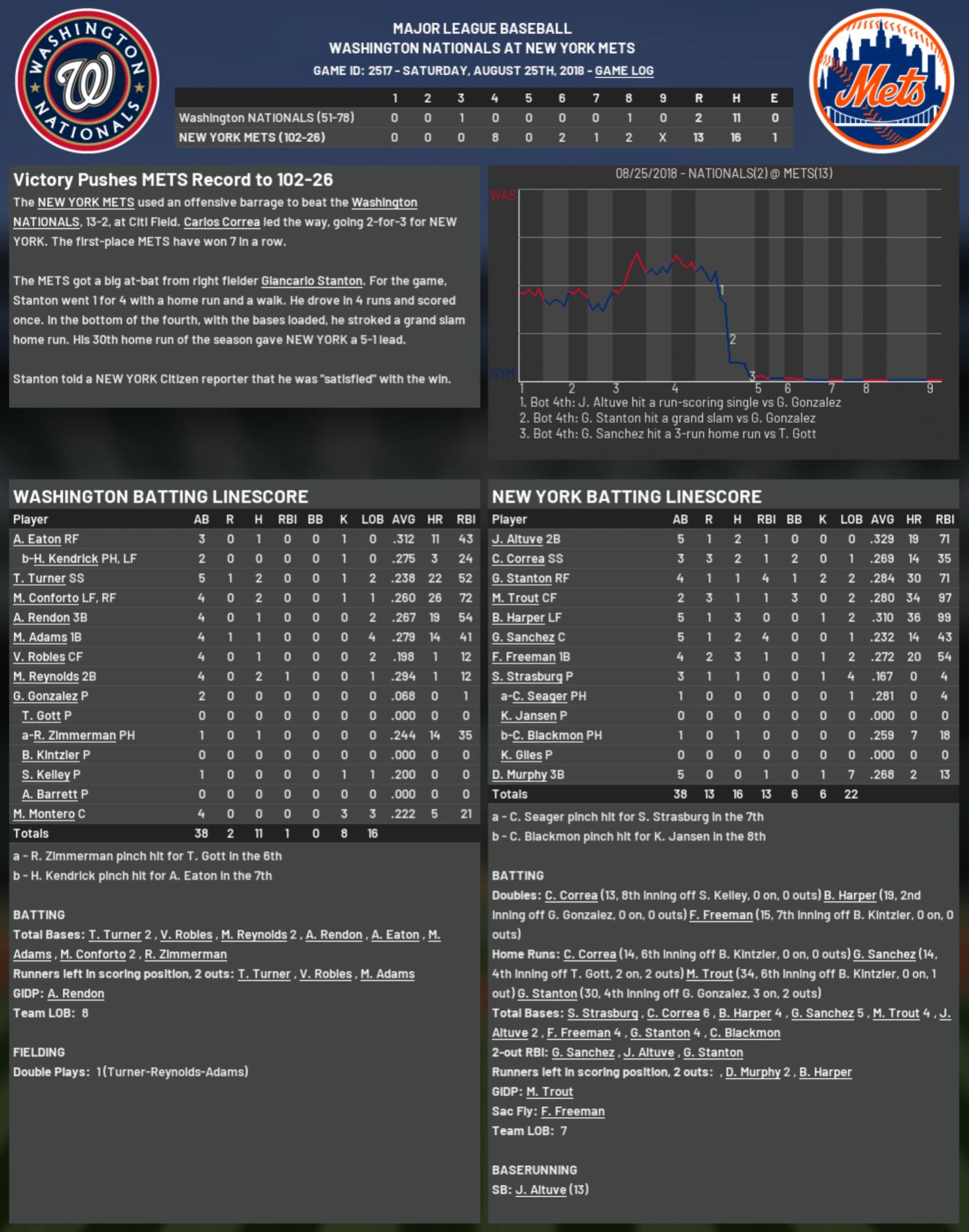 WAS Nationals 2 NY METS 13 Citi Field The Mets spotted the Nationals a run, then opened up the can of whoop-a$$! Not much to say here except Stephen Strasburg bended but didn't break. He gave up 1 run on 9 hits. Then the lineup took over. HRs: Carlos Correa (14), Gary Sanchez (14), Mike Trout (34) and Giancarlo Stanton (30), which was a Grand Slam! Bryce Harper and Freddie Freeman had 3 hits tonight. Tough call for the Golden Bat, but i will give it to Carlos Correa here. He went 2-3 with a HR, scored 3 times, got an RBI and walked twice. We win the series over WAS and look to sweep them with Sale on the mound tomorrow.
