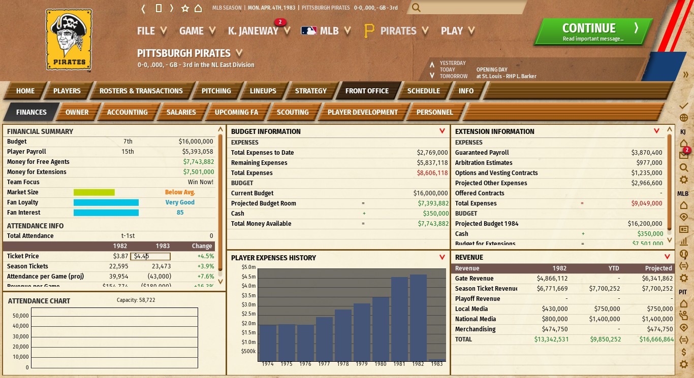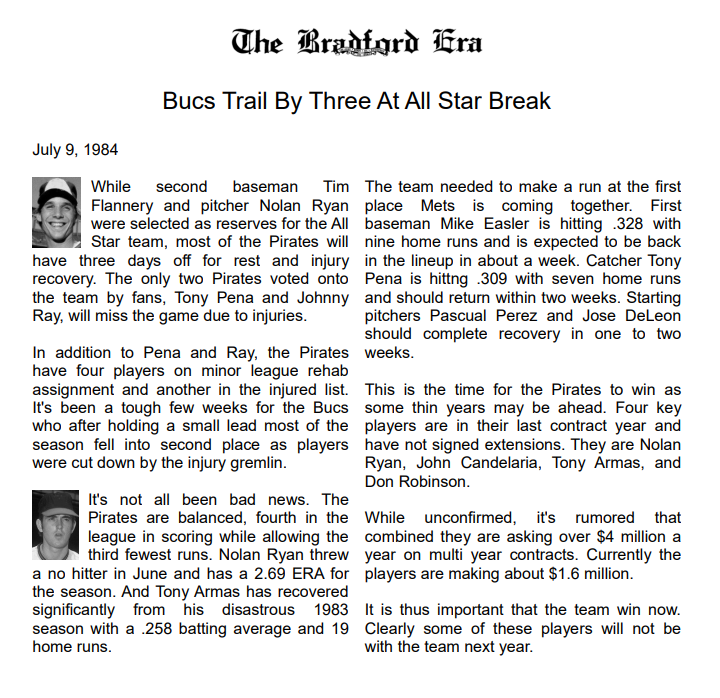 Richie Hebner was unemployed June last year and signed to a two year deal at league minimum. This year he's 136 games, .265 BA, 31 HRs, 4.1 WAR. (I don't mention modern statistics in the "newspaper" articles, just in comments.) Salary is $57,600. Somehow Mike Easler got to age 31 without three years service. But in 83 he's on an auto renew contract of $57,600. For 83 he's 141 games, .287 BA, 10 HRs, 1.9 WAR. John Candelaria isn't as cheap but he's still a bargain. He's in the fourth year of a five year deal that pays him $290,000 for 83. He's 19 - 8 with a league leading 2.25 ERA. His WAR is 6.4. Vance Law is a second year player making $57,600. In 158 games he's .274 BA with 8 HRs and WAR is 5.1. The Pirates started the season with the 15th ranked payroll at $5,393,058 and ended 14th ranked at $5,522,,266. Top AL payroll is Angels $9,020,402. Top NL Payroll is Expos $9,313,431. |