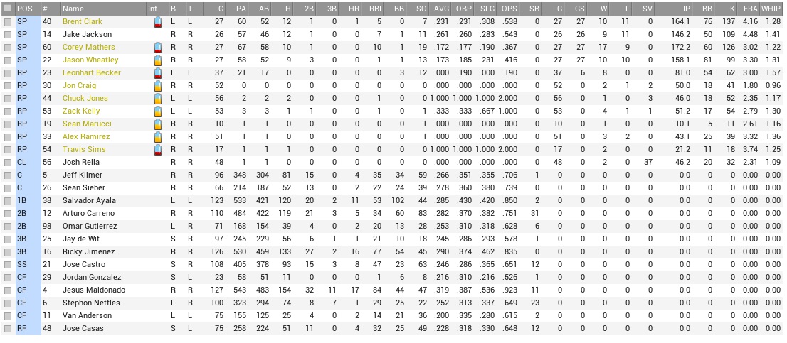 Another weird single-series trip brought the Raccoons back to the Bay, playing their last three against the Baybirds this year. You know, unless the Baybirds held on to their first place, and the Raccoons caught up with the damn Elks. Which was a bold position to take. Anyway, the Bayhawks were third in both runs scored and runs allowed, but we held a 4-2 lead in the season set. San Francisco had won four in a row, but were down two important bats in Danny Cruz and Ramon Sifuentes, removing 24 of their 64 home runs from the lineup in one swipe. Power was by far their weakest point in terms of offense, sitting third from the bottom in longballs. Projected matchups: Leonhart Becker (3-0, 2.83 ERA) vs. Miguel Alvarado (11-8, 2.79 ERA) Brent Clark (8-7, 3.76 ERA) vs. Garrett Sutherland (8-6, 3.85 ERA) Jake Jackson (9-8, 4.26 ERA) vs. Rafael Pedraza (9-10, 3.88 ERA) The week would start with a left-handed opponent, then two right-handed ones. Game 1 POR: 2B Carreno – C Sieber – 3B Jimenez – 1B Maldonado – RF Casas – SS Castro – CF Nettles – LF Jord. Gonzalez – P Becker SFB: SS Jorge Gonzalez – CF M. Hall – LF D. Martinez – RF S. Martin – C J. Hill – 2B B. Nelson – 3B Lusk – 1B Canas – P M. Alvarado Singles by Carreno, Maldonado, and Casas gave the Raccoons a run in the first, and Stephon Nettles opened the second with a triple in the gap, then had to wait two strikeouts until Carreno would single him home. Sauerkraut put the first three Baybirds in the bottom 2nd on base, then got a run-scoring 6-4-3 from Rodrigo Canas before whiffing Alvarado for damage control. Alvarado continued to get hit; Jimenez and Maldo opened the third inning with doubles, 3-1, and Casas singled home Maldonado immediately, 4-1. San Fran filled the sacks *again* on Sauerkraut in the bottom of the inning on a Jorge Gonzalez double and two walks to Scott Martin and John Hill, but then Bob Nelson rolled over to Castro to end the inning… Portland had three on and no outs in the fourth, Sauerkraut and Carreno walking ahead of a Sieber single to center. Jimenez’ 2-run double sent Alvarado to bed, with right-hander Steven Wilson yielding an RBI single to Maldo, and another run on Castro’s groundout, putting the Coons up 8-1. Sauerkraut allowed two runs in six innings in total, then was brought back for the seventh, which didn’t go quite as well. Hall and Dave Martinez singled, and Martin took him deep to left to end his day on 99 pitches. Thankfully, Stephon Nettles had hit a 2-piece in the top of the inning, and the Coons still led 10-5. Come the eighth, Bob Ibold, who had pitched the rest of the seventh, and Angelo Montano were taken deep back-to-back by Canas and PH Juan Brito, narrowing the gap to three, and then Alex Ramirez put the tying runs on base without getting an out; Gonzalez and Hall singld, Martinez got nailed, and I got ready to drown some of the ******* in the Bay. Ramirez struck out two, then WALKED two. Somehow Canas grounded out to end the inning… Top 9th, up 10-9, the Raccoons faced righty Jeff Draper, who conceded singles to Casas and Castro with one out. Nettles popped out before Sal Ayala hit for Jordan Gonzalez and walked. Three aboard, Kilmer batted for Ramirez, who was hiding somewhere far from the water, and Kilmer shoved a grounder through the right side for two recovery runs …! Better yet, Carreno socked a 2-run double into the corner in rightfield, and new pitcher Bryan Carmichael then filled the bases with two more Critters, then gave up a bases-clearing double over the head of Martin for another three runs driven in by Maldonado …! Casas hit ANOTHER double to center, eight runs across, and then Castro struck out. The Bayhawks didn’t quite recover from that drubbing in the bottom 9th. 18-9 Furballs!! Carreno 3-5, BB, 2B, 3 RBI; Sieber 2-6; Jimenez 2-5, BB, 2 2B, 2 RBI; Maldonado 4-6, 2 2B, 5 RBI; Casas 4-6, 2B, 3 RBI; Nettles 2-5, HR, 3B, 2 RBI; Kilmer (PH) 1-1, 2 RBI; (blinks!) Game 2 POR: 2B Carreno – 3B Jimenez – 1B Ayala – CF Maldonado – C Kilmer – RF Casas – LF Nettles – SS Castro – P Clark SFB: SS Jorge Gonzalez – CF M. Hall – LF D. Martinez – RF S. Martin – C J. Hill – 2B B. Nelson – 3B Lusk – 1B Canas – P Sutherland Carreno doubled and scored on two groundouts by Jimenez and Ayala to begin the Tuesday game, but the lead didn’t last when Brent Clark nicked Jorge Gonzalez and conceded that run on a Mike Hall triple. Amazingly though, Hall was stranded on a strikeout to Dave Martinez and two pops on the infield. Clark didn’t get much better after that, walking the bases loaded with nobody out in the bottom of the second. Sutherland put an 0-2 pitch in play – granted for a double play, but John Hill scored the go-ahead run. Clark then exploded entirely in the third, which saw the Bayhawks bat through the order against him. Single, hit by pitch, single (and the runner thrown out at home), and then with two outs: a walk, 2-run single, RBI single, 2-run double… by the opposing pitcher. After that, the Critters went to Bob Ibold, which netted the Bayhawks another three runs before the fifth inning was out, at which point, down 10-1 in both hits and runs, I longingly looked out to the Bay, wondering how lungs filled with water would feel, fifty feet under the surface. That was before Zack Kelly walked the bases full and gave up a 3-run double to Kyle Lusk in the sixth. For completeness sake, it should be mentioned that Maldonado drove in a run in the ninth inning, but that this didn’t amount to an actual rally of any proportion; for the most part I was in favor of the water-in-the-lungs bit. 13-2 Bayhawks. Montano 2.0 IP, 2 H, 0 R, 1 BB, 2 K; Bob Ibold (12.27 ERA) was done away with at this point, and replaced him with the next underdone right-hander, 2041 #42 pick Sean Marucci. He had started the year in AA, had 13-ish K/9 both there and in AAA, and … walks were a slight problem. Game 3 POR: 2B Carreno 