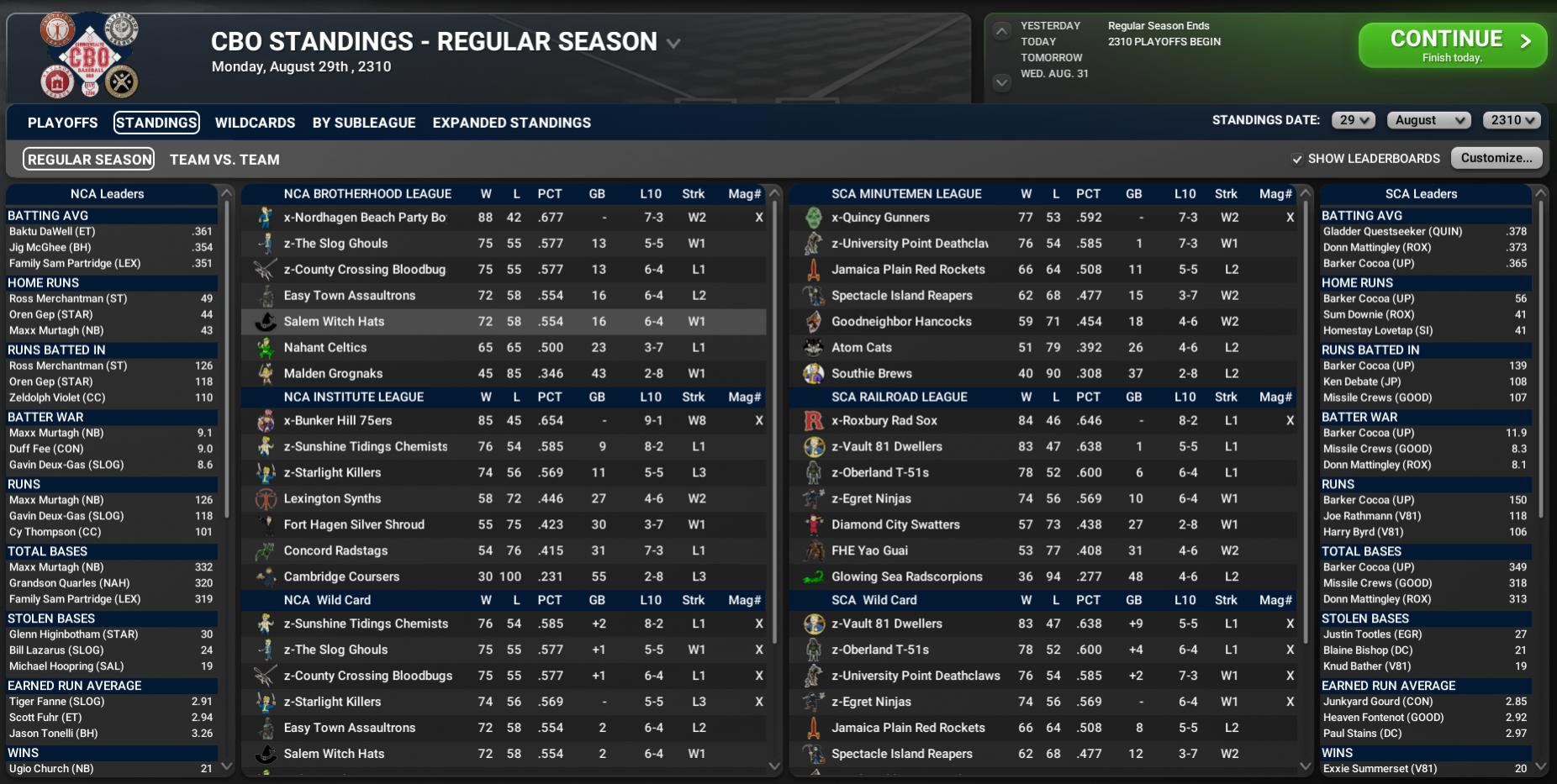 BNN Report News from the CBO, Minors, BCAC, and CYL by Nat Wright-Kawolski 22 August 2310 Last Week of CBO Season Promises Exciting Finishes We are down to our final week of the 2310 season. As of now, we know of 8 of the 12 teams in, but there are still lots of chances for a few teams to move in, out, up, or down. Let's take a look at a few scenarios. First, let's start with the SCA since all six spots have been clinched. We just do not know where they will end up. As of the current standings, the seeds look like this: 1. z-Vault 81 2. z-University Point 3. z-Roxbury 4. z-Oberland 5. z-Quincy 6. z-Egret Vault 81 leads the Railroad league by two games over the Rad Sox. Pretty much. the Dwellers will be seed 1 or 3, assuming the bottom does not drop out. Roxbury is in a similar position where they will probably finish either as seed 1 or 3. In the Minutemen League, both University Point and Quincy are in. They are playing for the #2 seed and then anywhere from #4-6. The Deathclaws won the season series 6-4, so they are listed as the league leader. Oberland and Egret are also in, so they are just looking to win some games to improve their seeding. Ending up at #4 is ideal for the first round. Earning the #3 spot would be difficult but not impossible. NCA 1. x-Nordhagen Beach 2. z-Bunker Hill 3t. Starlight 3t. The Slog 5. Sunshine Tidings 6. County Crossing Nordhagen Beach has clinched the Brotherhood League, ensuring that they will finish as the #1 or #2 seed. The Party Boys have a four-game lead over Bunker Hill with seven to play. The 75ers also know they are in and have a Magic # of 2 to clinch the Institute League. The wildcards are all still up for grabs. Starlight and The Slog played to a 2-2 series, so finishing with a tied record would mean either the CBO goes to other tiebreakers or decides to play a tiebreaker game. Easy Town, Salem, and Nahant are all still alive but would need to get hot coupled with a team or two above them collapsing.