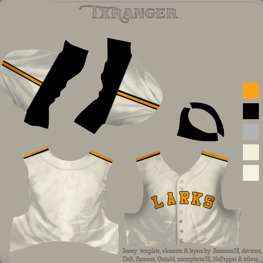 2. Here is the Lark set you requested... I edited an older Oakland Larks logo from an old Negro League team and made you a new set of jerseys to go with it... ![]() ![]() ![]() ![]() |