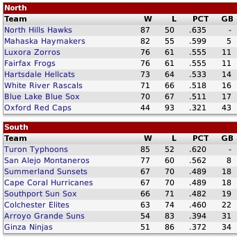 Tuesday, September 20, 2039 REDHAWKS EASY WINNER IN RU NORTH Picked fourth in the preseason poll, Far Mountain surprised the experts and won the Ruthlandian North Division in a breeze by eight games over second-place Kilkenny, the favorite... Ranford came in third, trailing by nine... LaGrange and Ancona were tied for fourth and 11 games back... Far Mountain went all the way to the Pro Cup Finals last season, but was swept by IPA champ North Hills. 1. Far Mountain Redhawks: won with outstanding pitching and lousy bats... second straight division title. Top Starters: Chad Cummings (25-8/2.84), Karl Nordheim (21-8/3.44) and Dennis Sasek (16-16/2.44) Top Relievers: Ryan Kolb (5-5/2.50/19 saves), Russell McIntosh (8-9/3.17/5 saves) Top Batters: RF Bert Richter (.277/23/85/84), LF Harlan Silver (.286/13/65/68) 2. Kilkenny Cats: strong pitching, weak offense... came in second last season, tied with LaGrange. Top Starters: Dave Whitaker (21-15/2.03), James Crockett (18-18/3.20), Judson Davis (16-8/3.72), Dave Stratford (15-17/3.65) -- Whitaker led the IPA with a 2.03 ERA Top Relievers: Joe Pierce (2-5/1.93/15 saves) Top Batters: star 2B Leevi Viru (.278/21/96/61), 3B Jorge Collazo (.278/11/64/83) 3. Ranford Bulls: made first divsion for the first time in five seasons with solid starters and pretty fair bats... was seventh in 2038. Top Starters: Frank Yosarian (20-11/3.52), Ronnie Schroeder (18-17/2.87), Ralph Hawk (16-16/3.08), Earl Cook (10-3/3.03/1 save) Top Relievers: (none) Top Batters: LF Dale Weston (.316/39/105/108) 4. LaGrange Sports: tied Kilkenny last year for the runner-up spot... better on paper than record... fine pitching and hitting stats, but were only two games over .500... had 169 HRS (8th). Top Starters: Ryan Janssen (16-12/3.30/7 saves), Hot Dog Huxtable (15-12/3.41), Mike York (15-17/3.38) and Walt Thurber (12-17/3.22) Top Relievers: (none) Top Batters: CF Deron Barkley (.283/31/80/93), SS John Rodgers (.282/16/82/93), RF Charles Bacque (.312/16/65/81) 4. Ancona Red Elephants: sixth last year... second division club for last four years... came in tied for fourth this season... pitching improved. Top Pitchers: Pablo Pilar (21-15/3.35), Lucian Kairis (16-7/3.21), Clyde Fairchild (13-14/3.75) Top Relievers: Steven Russell (7-6/3.30/12 saves) Top Batters: 3B Tommy Richardson (.360/30/132/87), C Gregg Straka (.300/4/52/70)... Richardson had a fantastic year... was second in the IPA in batting average (.360), in hits (220), third in doubles (39) and first in RBIs (132). 6. Valmara Vipers: wound up in sixth place and the second division for the seventh year in a row... lackluster pitching and hitting. Top Starters: Harold Hudson (17-16/3.82) Top Relivers: Clark Van Vreeland (8-6/2.40/15 saves) Top Batters: LF Gary Peterson (.346/29/70/73) 7. Taranto Tars: fourth-straight year in the second division... mediocre pitching, not much at the plate except for HRs (179-4th) (due to the small part). Top Starters: rookie Mario Martinelli (17-9/3.09)... Doug Hansack (16-14/3.76) Top Relievers: (none) Top Batters: 1B Mark Delaney (.265/33/98/81), CF Gary Tramonte (.309/30/71/71) 8. Glasco Athletics: fell to last place after three-year run in the first division of the RU North... average pitching, lacks scoring, but does hit with power (156 HRs-12th). Top Starters: Basil Newchurch (15-15/3.26) Top Relievers: Steven Derby (3-4/3.41/3 saves) Top Batters: SS Terry Johnstone (.277/18/78/82), CF Travis Houston (.303/21/76/68), 1B Tim Jarvis (.280/12/60/86) RUTHLANDIAN NORTH DIVISION Last edited by Eugene Church; 10-16-2013 at 04:39 PM. |