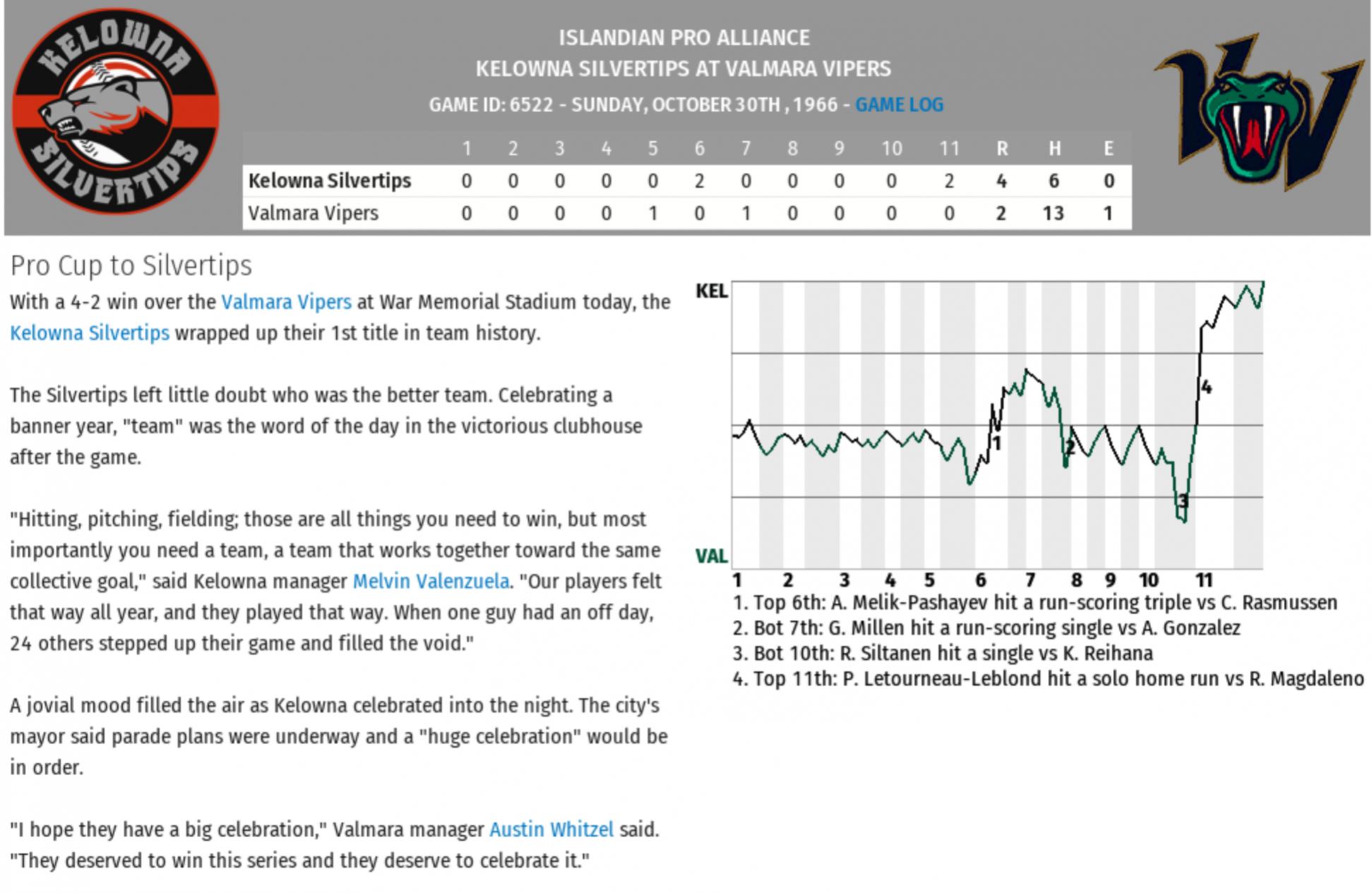 Valmara will try to capture their 4th Pro Cup title, and the 7th straight championship for the Ruthlandian Union. Kelowna is here for the first time and are slight underdogs. Edge goes to Valmara because their pitching is superior. My prediction is Valmara in 7. Last edited by jg2977; 12-25-2021 at 09:29 AM.  |