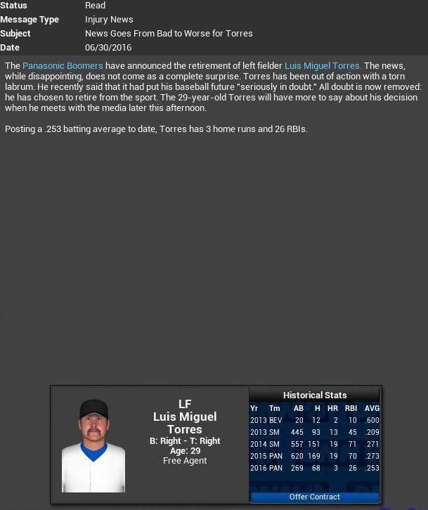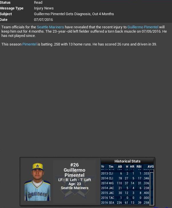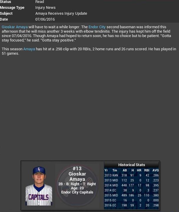 Amaya will be out for 3 weeks. OF Jem Argenal was recalled from AAA. Dave Valley is suspended for 8 games due to a bench clearing brawl. When his suspension ends he will take Jem's spot. Potentially good trade for Springfield. Donny "Pudge" Druzbik is having bad year but is still a great offensive catcher. If he can turn things around with a new change of scenery, he can help Springfield take the west. BC was weak in CF. Mariners OFers are dropping like flies.