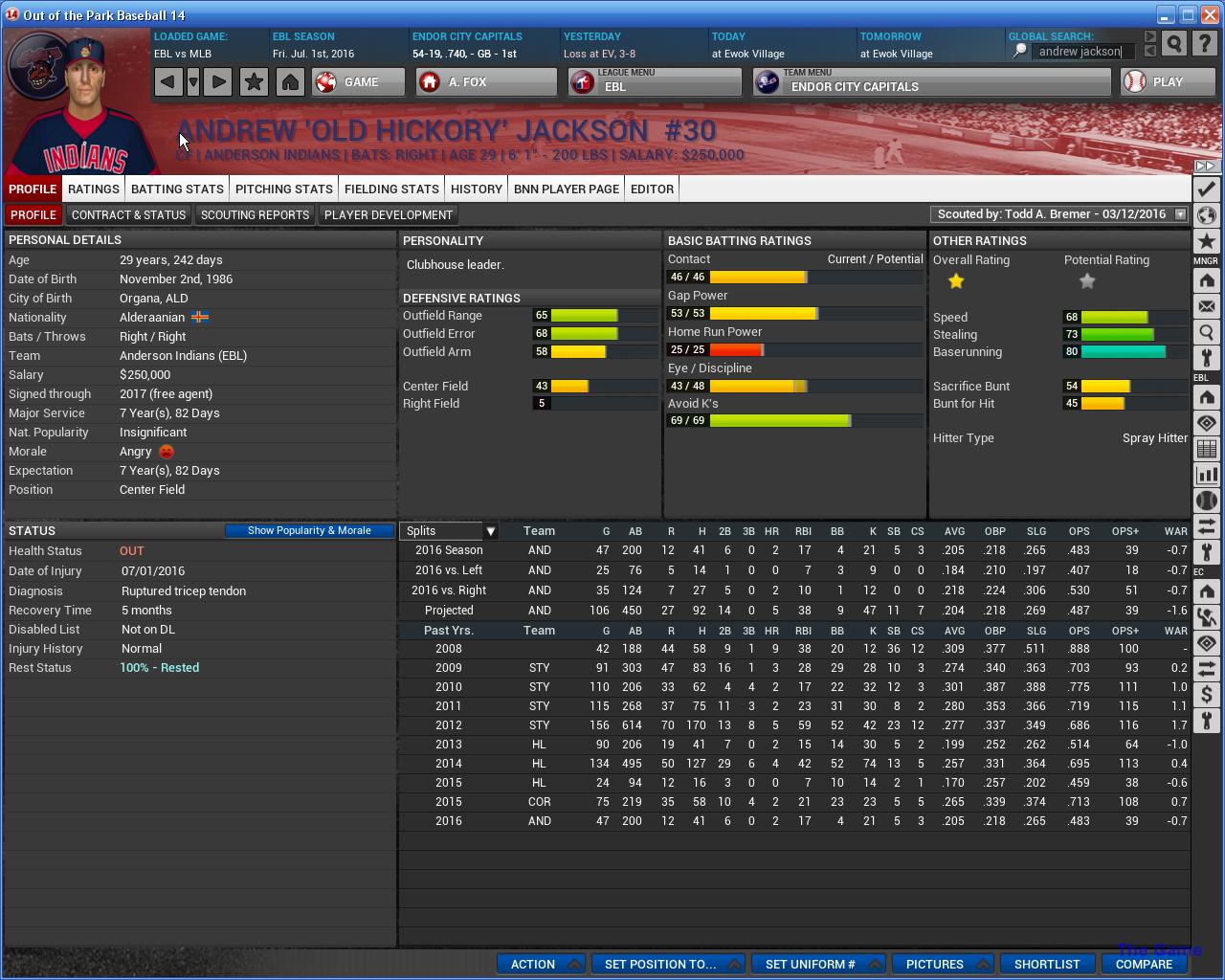 Anderson CF Andrew Jackson will miss the rest of the 2016 season with a ruptured tricep muscle (predetermined)