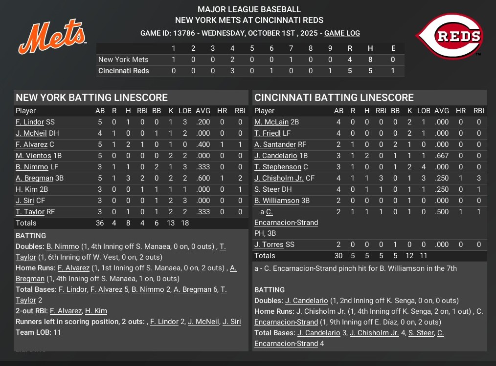 MLB news: Oct. 1 -- NL Wild-Card Series Game 1 - Cincinnati Reds 5, New York Mets 4