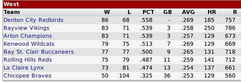 Monday, September 17, 2040 DC REDBIRDS FLY BY ARLON AND BAYVIEW After 27 frustrating years of failure, the Denton City Redbirds finally put together a season good enough to win the Tycobbian West Division... they took command of the race with a great 19-10 month in August to fly by defending champ Arlon and Bayview by three games... the Kenwood Wildcats came in fourth, winding up 7 games off the pace. 1. DENTON CITY REDBIRDS (86-68): the Redbirds were a power in the early days of the IPA, making the postseason eight times in the first 12 seasons of the league... six of those years they won the division... twice the Redbirds made it to the Pro Cup Finals, but didn't win... that was in 2005 and 2008... now Denton City is back again with a capable club that features good pitching with a 3.61 ERA (8th)... good bats with a .269 BA (5th), 757 runs (5th) and 185 HRs (9th-tied)... defense-wise they are only average with a .971 FA... Denton City could be a factor in the Pro Cup playoffs this year. Top Pitchers: Francisco Salcido (21-14/3.43), Freddy Hogue (16-7/3.40), Troy McIntosh (17-14/3.28) and Kevin Blevins (13-6/3.82) were the main starters... Harry Elliot (4-9/3.13) was off-and-on in the bullpen, but he did save 21 games. Top Batters: the Redbirds had a good core of hitters, sparked mainly by All-Star 1B Wayman Stetson with 43 homers, 136 RBIs, 98 runs and a .330 BA... Stetson wound up third in RBIs and eighth in home runs in the IPA... the other solid bats were C Felton Welch (.297/27/86/73), RF Pete Doyle (.272/24/75/111), SS Sammy Thornton (.306/4/74/92)... a new addition to the club was LF Sadaharu Uchiyama (.293/13/63/81), who was acquired in June in a trade with Ginza... he is 32 years old and a career .301 hitter and a Golden Glove outfielder. 2. ARLON CHAMPIONS (83-71) (3 GB): they went to the Pro Cup Finals last season, but were beaten out by the IPA champion Waleska Westerners in six games... the Champs have made the postseason only four times in history... a drop off in pitching played a role this year... the team ERA fell from 3.31 in 2039 to 3.74 in 2040... the bats were off a little, too, dipping from .262 to .257... however defensively Arlon was fine with a .977 FA. Top Pitchers: Lanny Gray (21-7/2.31) was the ace with help from Peter Shannon (14-12/3.64) and Ronny Farnsworth (16-17/3.48)... Farnsworth had a down year... he was 21-8 in 2039 with a 2.64 ERA... Pat Stuyvesant (10-13/4.75/8 saves) was off as well... Stuyvesand was 20-9 last year. Top Batters: RF Mark Cameron (.289/40/116/93), All-Star C Nick Shafer (.296/18/94/67), LF Charley Hastings (.306/17/50/114), 1B Robby Westin (.301/21/79/47). 2. BAYVIEW VIKINGS (83-71) (3 GB): better pitching moved the Viks up from fifth (17 GB) to the runner-up spot this season... 2016 was the last pennant... so this was a very exciting season for the fans... on the hill Bayview improved from 4.47 ERA to 3.83 (18th)... they are just an average club with a .258 BA (18th), but make up for it with 250 HRs, the best in the IPA and almost a new season record... 260 HRs by Arroyo Grande in 2005 is the all-time team record... leading the way with a record-breaking 66 HRs was superstar 2B Jerry Culpepper... he beat Jack Elliott's 65 for High Mesa in 2021... Culpepper has hit the 60 mark three times now with 63 in 2039 and 60 in 2037... in a truly superlative season Culpepper hit .334, third best in the Tycobbian Union... he also topped the IPA with 146 RBIs and 134 runs... Bayview had nine players with 10 or more homers... SS Andreas Stokke (.246/29/83/77) had 29, RF Roy Ricks (.330/28/81/92) hit 28, All-Star CF Ivar Nilssen (.287/25/84/66) popped 25, LF Derek Jorstad (.252/21/57/80) knocked 21 out of the park, 1B Barrett Bosch (.300/18/51/53) had 18, 3B Giles Butler (.231/16/50/58) totaled 16, C Dan Abbott (.227/10/46/42) chipped in 10 and OF Cleve Belton (.246/10/20/25) added 10... on the mound Vance Codsworth (23-13/2.78) had a standout season and got help from Lucky Luciano (17-11/4.13), Karl Magga (14-13/3.73) and Christy Kane (13-11/4.01)... on defense the Viks are just average with a .972 FA. 4. KENWOOD WILDCATS (79-75) (7 GB): the Wildcats faded in the final weeks of the season and ended up in the fourth spot in the standings... they were neck-and-neck for a good while... it's been 17 years since Kenwood made the playoffs, but they have come close in recent years... missing out by two games last year and also by two games in 2037... in 2030 they lost by only one game... 2024 was the last postseason year... the Wildcats have only two pennants in their history, but they chalked up a Pro Cup in 2014... Kenwood's strength is its pitching (3.45 ERA-4th)... the offense is a little less than average with 669 runs (22nd) and 129 roundtrippers (25th)... defense is good with a .974 FA. Top Pitchers: Freddy Gooch (18-10/3.25) led in wins... Glen Murray (17-20/2.81) in ERA... and Ben Abramo (15-14/4.14) had some quality starts, too... Artemus Hale (4-5/1.83/13 saves) was the best reliever. Top Batters: All-Star C Corky DiNozzo (.323/39/95/69) topped the team in BA, HRs and RBIs... 2B Country Crowder (.320/3/61/88) and LF Harry Tashina (.304/12/68/56) also had good years average-wise. 5. BAY ST. CLAIR BUCCANEERS (77-77) (9 GB): after four miserable years in last place or near last place, the Bucs broke even this year and came in fifth... they hit a respectable .265 (11th), scored 718 runs (12th) and had 131 HRs (24th) with a decent 3.86 ERA (19th)... the Buccaneers have seven TU West pennants in their history, but no Pro Cups... the last time they made the playoffs was in 2030. Top Pitchers: John Karlsen (18-16/3.58), Mac Shaw (14-14/3.33)... in the bullpen Pete Cross (5-3/2.15/18 saves) did well. Top Batters: at 35 star RF Cotton Cornwall (.314/20/85/86) had another solid season... he led the club in BA and RBIs, and tied for the HR lead... CF Gilbert Bauer (.262/19/60/94) had the most runs... 3B Bailey Holmsworth (.281/20/69/57) tied for the HR 