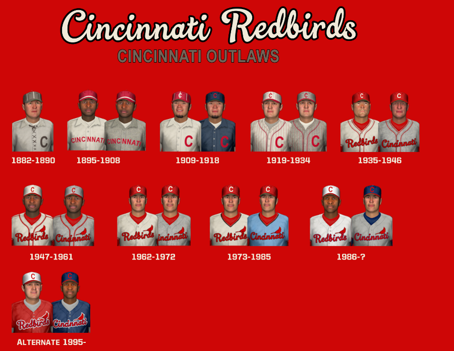 Here's a set of through the era's Jerseys for the Cincinnati Redbirds I did several months ago. I did these to practice making jerseys in Photoshop using one of cephasjames team names. As such I take no credit for the team name or general colors, but I do like how these turned out so I thought I'd release them. These were all made with a template NoPepper sent me some months ago with some minor alterations of my own for good measure. I even made a cool chart showing the progression: ![]() Download Enjoy! The one thing I didn't do is logos for every era so if any of knuckler, txranger, or someone else wants to tackle that than be my guest.