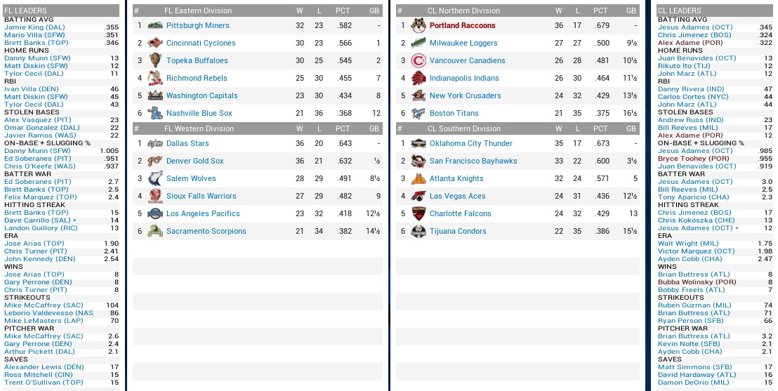 The two best teams in the entire league (by winning percentage) met in Oklahoma City starting on Monday. The Thunder had won seven straight and sat first in runs scored and second in runs allowed, while Portland ranked third and first, respectively. They had the better run differential at +152 (Coons: +115), although their rotation was remarkably average with a 3.98 ERA between the starters, which was not even top half in the CL. A lack of speed was however the only other major stat category in which they did not at least encroach on the top 3, and they led many offensive categories, including batting average (.289!), OBP, and homers. They had also wiped the floor with the Raccoons in a 3-game sweep in the first meeting of these teams during the year. Projected matchups: Jake Jackson (9-4, 3.23 ERA) vs. Danny Orozco (2-2, 3.06 ERA) Jason Wheatley (8-4, 2.89 ERA) vs. Juan Ramos (8-8, 4.64 ERA) Sadaharu Okuda (7-5, 2.84 ERA) vs. J.J. Hendrix (6-7, 3.60 ERA) Orozco was the only left-handed starter for the Thunder. Game 1 POR: SS Adame – CF Herrera – 1B Maldonado – LF Toohey – RF Pellicano – 2B Waters – C Gonzalez – 3B Martell – P Jackson OCT: LF Zurita – 2B Ban – RF Benavides – SS R. Cox – 1B Humphreys – C Adames – 3B Greer – CF J. Price – P Orozco Waters hit a single in the first, Martell drew a leadoff walk in the third, but neither of them reached even third base, while in between a pair of full counts to begin the bottom 2nd led to an infield single for Ryan Cox, a walk to Steve Humphreys, and after Jesus Adames was doubled up, still a 1-2, 2-out RBI single through the left side by Marshall Greer. Portland got Maldo on base to begin the fourth inning, owing to an error by Gold Glover and current CL Player of the Week Jonathan Ban. Orozco lost Toohey on balls, then Gene Pellicano with a single, presenting Matt Waters with three on and two outs. A sac fly to right tied the game, but was all the Raccoons could scratch out, with a Gonzalez pop and Martell K ending the inning. The middle of the order kept wearing out Jackson, who always ended up in long counts with the 3-through-6 batters, and usually lost the fights. Two got on base the second time through, while Juan Benavides singled in the sixth, but was stranded on first base. Jackson crossed over 100 pitches, however, and was hit for in the top 7th of the 1-1 tie. With Martell on first after another leadoff walk, Pat Gurney hit for Jackson and hit a slow roller at the third base line. Marshall Greer threw him out, but also hurt himself and left the game for Nick DeMarco to replace him. More groundouts by Adame and Herrera stranded the go-ahead run at second base. Portland had Maldo and Waters on base with singles, but still couldn’t score in the eighth, while Bob Ibold and Jake Bonnie kept the Thunder off home plate as well, and in the ninth nobody reached base at all against John Steuer for the Thunder and Nelson Moreno for the Critters. A Maldo single and Toohey double with one out in the 10th – still against Steuer – sure generated a chance, however, putting the go-ahead run at third base. Derek Baskins hit for Pellicano and amounted to a sac fly. Waters whiffed. Mike Lynn was sent out on a third straight day, then saw Jayden Lockwood leg out an infield single from the #7 spot. The lead runner was erased on Jim Price’s grounder to Waters, and Lynn struck out Jose Zarate and Angelo Zurita to end the game. 2-1 Critters. Maldonado 2-5; Waters 2-3, BB, RBI; Jackson 6.0 IP, 4 H, 1 R, 1 ER, 2 BB, 5 K and 1-1; Consecutive extra-inning wins – but if you scored some more and a bit earlier, boys, we could grab dinner in time! That should get them going. Game 2 POR: SS Adame – RF Mercado – 3B Maldonado – 1B Toohey – 2B Waters – CF Herrera – LF Fernandez – C Morales – P Wheatley OCT: LF Zurita – 2B Ban – RF Benavides – SS R. Cox – 1B Humphreys – 3B DiMarco – C Zarate – CF J. Price – P J. Ramos Wheats bled three singles in the first two innings, but didn’t allow a run yet, then batted with Manny (leadoff single) and Morales (walk) on second and first and nobody out in the top 3rd. He failed to bunt all the way to two strikes, then poked a 1-2 pitch to the shortstop, which Ryan Cox flummoxingly threw way past Humphreys for a run-scoring, 2-base error, and the first run of the game. But despite now having runners in scoring position and nobody out, the Raccoons could not tack on; Adame popped out to Juan Benavides in shallow right, way too shallow to send Tony Morales, and Mercado grounded out to first, which also kept Morales pinned. Maldonado grounded to Cox – and another throwing error, this one sailing clean into the dugout! Toohey struck out, but the Raccoons had gone up 3-0 on pretty much nothing in the inning. Now Wheats just had to hold up. When Juan Ramos opened the bottom 3rd with a hit, I knew we were ******. Zurita hit another single, Benavides an RBI single, and with two outs, Steve Humphrey smoked a 3-run homer. That 4-3 lead was all earned for them… Top 4th, the Coons opened with Waters and Herrera singles before finding Morales and an inning-concluding double play, while in the fifth they put their first two batters even into scoring position on a single by Wheats and an Adame double to left. Mercado fell to 0-2 before flipping the score with a slapper that bounced on second base as it made its way to centerfield, 5-4, while Cox’ black day continued in the bottom 5th, where he hit into a force play to remove Jonathan Ban from the bases, then was picked off first by Wheats to complete five. Wheats went seven after the tremendous third-inning whacking, maintaining the 5-4 lead for the duration of his stay in the game. The third aside, he had pitched a 3-hitter with six strikeouts. Right-hander Danny Landeta was in the game for Oklahoma in the eighth when Waters and Herrera went to the corners with a pair of singles and one out. Manny poked the first pit