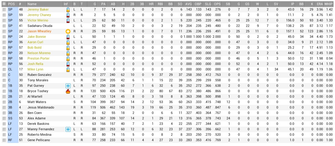 Monday was a day off, but for Jason Wheatley it was a day on, coming back onto the roster from the DL after the minimum 15 days. The Critters would slot him right back into the opener for the Indians series on Tuesday, while dropping Jeremy Chaney into the bullpen into a garbage innings role. We were now at 30 players on the extended roster, 15 arms and sticks each.