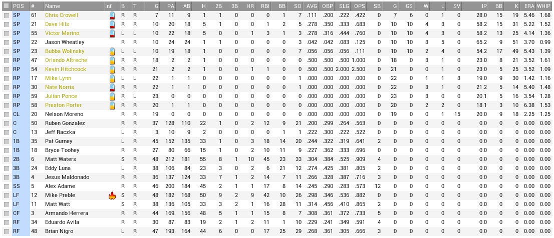 The Raccoons were already going to nowhere, but the Crusaders were still worse. Eighth in runs scored and sixth in runs allowed somehow worked out to a -19 run differential and 11 games under .500, and they were 2-4 against the Raccoons this year. New York was without SP Carlos Malla, CL Jeff Frank, and infielder Randolph Nash. The Critters still had Mike Preble and Bob Ibold on the DL. Projected matchups: Victor Salcido (1-2, 2.93 ERA) vs. Jeff Johnson (4-7, 3.79 ERA) Victor Merino (5-5, 4.77 ERA) vs. Taylor Stabile (5-1, 2.10 ERA) Jason Wheatley (4-6, 3.83 ERA) vs. Sal Chavez (6-6, 3.88 ERA) Three more right-handers coming up in this series. Game 1 POR: LF Watt – CF Herrera – 1B Maldonado – RF Gurney – 2B Waters – 3B Luna – SS Adame – C Gardner – P Salcido NYC: 1B Haertling – 2B R. Martinez – SS Gates – C O. Ramirez – CF D. Hernandez – LF Garris – 3B Haney – RF Foss – P J. Johnson The week started out really great. Salcido struck out the first two he faced, then allowed a single to Prince Gates and a homer to Omar Ramirez, and when Matt Waters led off the top 2nd, he got beaned out of the game. Tim Rogers replaced him, Eddy Luna walked, but the bottom of the order croaked and nobody scored. The team didn’t get a hit the first time through the order, while the Crusaders got another two singles off Salcido in the bottom 2nd, but stranded those. The Coons’ entry into the H column was a gap triple by Luna with one out in the fourth. Alex Adame hit an RBI double to left to cut the deficit in half, but then Wade Gardner grounded out and Salcido whiffed to end the inning. Through four innings, young Salcido was on six strikeouts… but also three homers, giving up solo shots to both Josh Garris and Aaron Foss in the bottom 4th, falling behind 4-1 in the process. He got bopped around some more in the fifth, giving up a run on an RBI double by Garris, then allowed a single to Mark Haney, too, and was yanked for Ponce with two outs and two aboard. Ponce struck out Foss to close the book on Salcido at 4.2 innings, five earned runs, and all deserved… Top 6th, Johnson plunked the #5 hitter again, which was about the only way to get Tim Rogers on base, then gave up duck snort singles to shallow center to both Luna and Adame, filling the bags with one gone and bringing up Gardner as the tying run. He lined out to Haney, but Johnson walked in a run against PH Brian Nigro. Watt ran a full count, then flew out to Dave Hernandez to leave the tying runs on base. Nate Norris pitched the next two innings, giving up a run on a Prince Gates double in the sixth, which proved the final run in a listless loss for the Critters, in which they had to use Nelson Moreno in the bottom 8th to continue to make ends meet at all in the pen. 6-2 Crusaders. Luna 2-3, BB, 3B; Adame 2-4, 2B, RBI; Nigro (PH) 0-0, BB, RBI; Matt Waters hit the DL by Tuesday morning with a bad bruise on his elbow, but fortunately no structural damage. Of course, an already watery Coons lineup only got worse with that… 22-year-old Rich Seymour had played nine games with Portland earlier this year, hitting .167, and was brought back from St. Pete. He was hitting .262/.347/.369 with the Alley Cats. With both Preble and Waters on the DL, the team home run lead among active players devolved onto Pat Gurney and Bryce Toohey with five each. Oh, wait… Game 2 POR: CF Watt – 3B Luna – 1B Maldonado – LF Gurney – C Gonzalez – RF Nigro – SS Adame – 2B Seymour – P Merino NYC: 1B Haertling – LF Garris – SS Gates – CF D. Hernandez – 2B R. Martinez – 3B Haney – C Brewer – RF Foss – P Stabile The Coons had four hits in the first inning, barely scoring a run, since there was also a 9-2 double play weaved into that inning when Maldo came up with runners on the corners, flew out to Foss, and Watt was thrown out at home plate in the same go-around. Ruben Gonzalez eventually singled home Luna, and that was that. Ed Haertling tied up the score on the first pitch by Merino, homering mighty deep to right. Haertling would also have a hand in taking the lead in the third inning, hitting a leadoff single to left that Gurney overran for an extra base, which allowed Haertling to score on two groundouts afterwards, which then made it 2-1 New York. But the Coons came back, in rather bizarre fashion. Merino whacked a gap double to lead off the fifth inning, then scored on a 2-base throwing error by Ricardo Martinez, who peppered a Matt Watt grounder into the first base dugout. That got us even at two with the go-ahead run in scoring position. Luna singled to make it corners for Maldo again, and Maldo found another double play, a more conventional 6-4-3 this time, but that got Watt home to grab that 3-2 lead. Maldo had another chance for a double play with Watt and Luna on second and first, respectively, in the seventh, but this time only flew out to Foss again. Gurney then grounded out against Ryan Fentress to bring about the stretch. Merino pitched still in the bottom 7th, faced four lefty hitters, and gave up straight 1-out singles to the latter three of them, Tom Labedz, Haertling, and Garris. That tied the game and got Merino sent for the showers. Hitchcock replaced him, got a double play from Prince Gates, and Merino ended up with a no-decision. The Coons wasted Gonzalez and Adame singles in the eighth, while the Crusaders left the go-ahead run on third base in the bottom of that inning, where Martinez arrived on a 2-base throwing error by Rich Seymour and a wild pitch by Nate Norris. Nobody even reached scoring position in the ninth, giving the Coons’ beleaguered pen extra innings to contend with. The Coons’ best bet in the tenth was a Gurney fly to deep center that was nevertheless caught, while the Crusaders got a 1-out double by Ron Arens to left against Orlando Altreche in the bottom 10th. Martinez grounded out, but Randy Anton (who?) pinch-hit for pitcher Sean Yates with two outs and made Yat