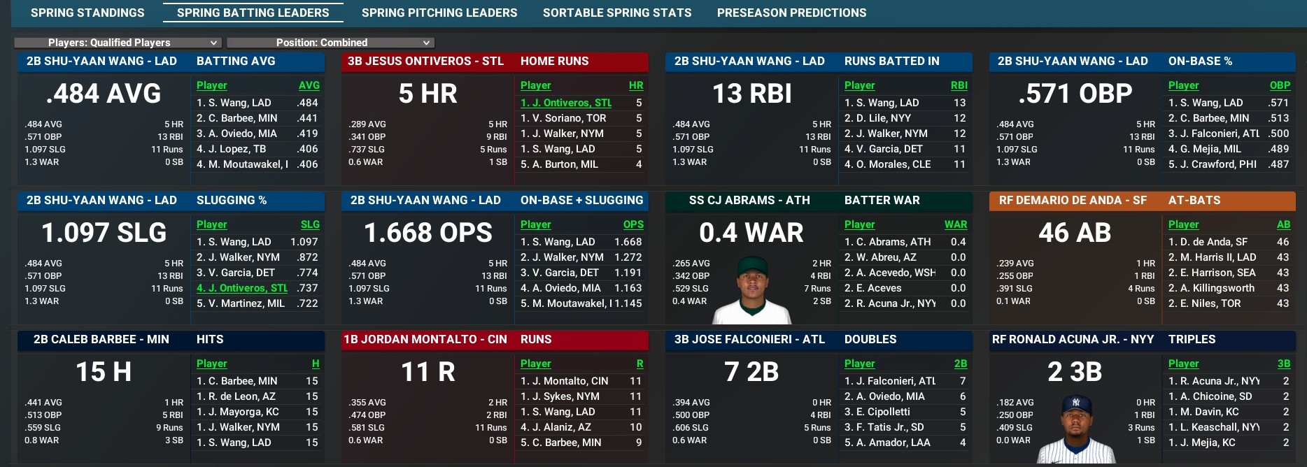 MLB news: March 8 -- Spring Training - Standings and leaders after 20 games