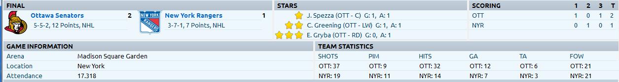 Huge win vs rival Toronto. Kessel scored around the 7 minute mark and then the Senators woke up and netted 3 themselves. Colin Greening, making a bid to stay on the top line with Spezza and Alfredsson scored twice, his 3rd and 4th of the season. Zach Smith scored his first of the season adding some punch from the 3rd unit. Mark Stone was a callup for the game and played pretty well on the 3rd line with Zach Smith. He added an assist on Smith's goal and was solid overall.