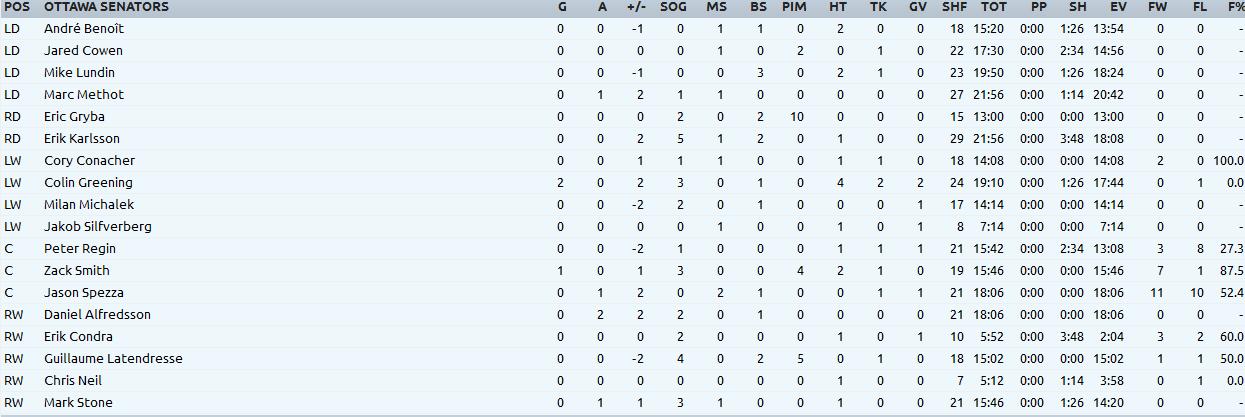 A big win tonight vs one of the better teams in the game, the Canucks. Unfortunately before the game, Daniel Alfredsson was injured during practice and will be missing some time. Mark Stone, who has played fairly well since coming up will take his place on the top line to see if Spezza can start producing with a true shooter.