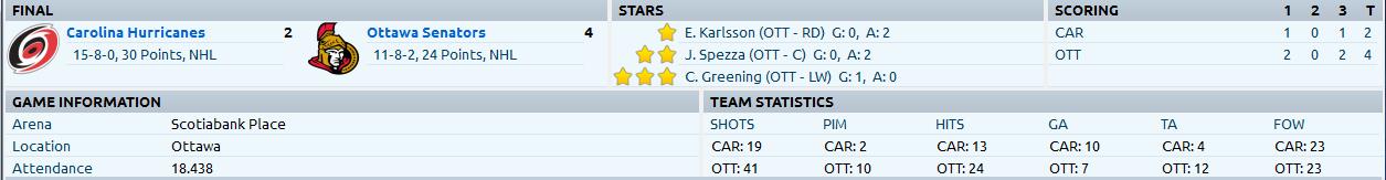 Another decent game against the top team in the Eastern Conference, the Hurricanes as the Senators skated to a 4-2 victory. Greening (6), Michalek (4), Regin (2) and Latendresse (7) Scored for the Senators while Robin Lehner made 17 saves for the win.
