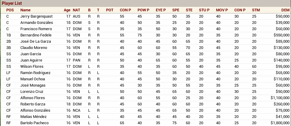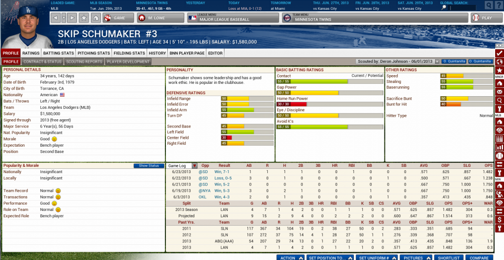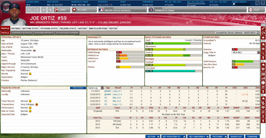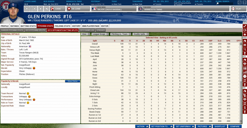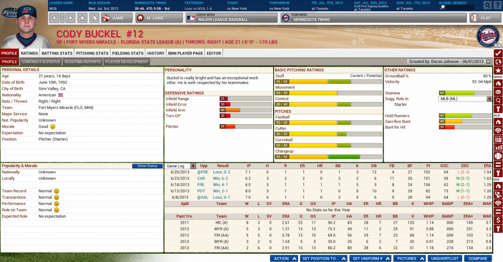 Game 78: Thursday, June 27, 2013 Boxscore Twins Record: 36-42 Game 79: Friday, June 28, 2013 Boxscore Twins Record: 37-42 Game 80: Saturday, June 29, 2013 Boxscore Twins Record: 37-43 Game 81: Sunday, June 30, 2013 Boxscore Twins Record: 38-43 Now that we're caught up on some box scores, let's talk about how the extended weekend went for the Twins. In the 4 game set with the Royals, the Twins won 3 of 4, winning all 3 of their games by just one run, one of which was a 17 inning affair. All three of the wins were done so in walk off fashion, with the aforementioned extra-inning game seeing the Twins score 1 to win in the 17th, another game having 2 scored in the 9th to win, and finally, on Sunday, a 3 run outburst to bring the win home in the 9th. Mix in an 8-0 lose on Saturday, and you have a pretty solid weekend series for the Twins who now share the same record as the Royals and sit tied for 3rd in the AL Central division, 8.5 backs of the White Sox and 8 games back of a Wildcard berth. With it now being July 1, this is a good time to take a look around at a few things. Joe Mauer continues to put up MVP numbers, and is a lock to be the AL All-Star starting catcher on July 16th. Take a look for yourself at the league batting statistics, and how many times he appears. ![]() Here are the league pitching leaders. Notice the HR/9 leaders are loaded with Twins. Thanks Target Field! ![]() One thing I noticed while poking around was that the Twins are the only MLB team on pace to have a negative balance in projected budget room. This is something I'd like to address this month with the trade deadline just a few weeks away. Even with a nice string of wins, it's clear to me this team isn't doing much this year, so it's time to clear some money off the books. Lastly, the International Amateur Free Agent signing period has begun. Here are some screens of the kids: ![]() And the pitchers: ![]() ----------------------------------------- Around MLB: July 6th draft pick signing deadline approaching (Twins are done, 2 guys will renenter draft (picks 1 and 4). |