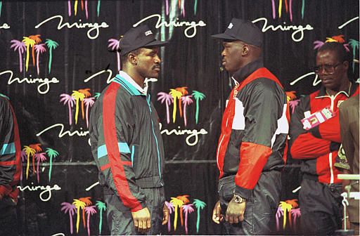 Just days before the media was set to descend on San Antonio for the pre-fight media events surrounding the Mike Tyson vs George Foreman heavyweight title bout, the WBC and promoter Don King announced a January 6th fight between undefeated Evander Holyfield and WBC #1 contender James "Buster" Douglas for the organization's now vacant title. ![]() Holyfield and Douglas staredown during the fight announcement press conference... *************************** Alex Stewart will face Everett Martin on the undercard of Tyson/Foreman in a rematch of the September 2nd bout that saw Stewart loose for the first time in his career due to a 1st round stoppage on cuts. John "The Beast" Mugabi has signed a deal to face Darrin "Schoolboy" Van Horn in an IBF eliminator bout to be held on January 13, 1990. The winner of the bout will fight for the IBF Junior Middleweight title in either May or June. The IBF title is currently held by veteran Gianfrano Rossi. While 3 Rivers Fight Club owner Jason David Green had been seeking a title bout for the returning "Marvelous" Marvin Hagler, that seems unlikely for now. Rumors are swirling that Hagler is close to announcing a fight against the Ring Magazine comeback fighter of 1989, Roberto Duran. The two faced off in a tightly contested bout in 1983 and the rematch is expected to take place in January, perhaps on the same card as Mugabi vs Dan Horn. Despite his string of dominating title defenses over the last several years, bettors have moved the line on the Tyson vs Foreman bout to 1-1. Tyson opened as a 5-2 favorite, only to see a flood of bets on Foreman swing the line back to even. Last edited by DJgreen_72; 01-15-2014 at 12:00 AM. |