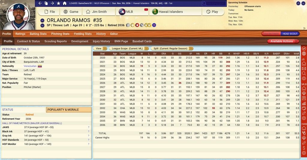 Say goodbye to... ...P Orlando Ramos. Signed out of Venezuela by the Pirates in 2014; traded to BOS in 2017 for a non-entity reliever; he was the premier power pitcher in the '20s, with decent control to boot; 2022 Cy Young winner; gave up single-season record 55 HR in 2032; retired 5th overall in strikeouts. HoF? Maybe. Tons of Ks not as impressive in this era. Still, it is a lot of strikeouts. ![]() ...P Cobi Johnson. 1st round pick by STL in 2014; iron man with seventeen straight seasons of 30+ starts; built up nice career numbers by just staying healthy; 10th all-time in Ks; got his Cy Young in 2029 with LA. HoF? Career numbers say probably, Hall metrics say probably not. ![]() ...1B Colin Moran. 1st round pick by MIA in 2013; another iron man, just never got hurt while playing for great RIC teams; also very well-fed; was a doubles machine, retiring 6th all-time with 675; also 20th in career hits with 3074. HoF? Most likely, due at least to 3000 hits, even though Bill James would probably call those "hang-around" numbers. ![]() ...3B Mason Templet. 1st rounder by MIN in 2016, but failed to sign and taken 1st by TOR in 2017; traded to BAL for Manny Machado; solid, consistent, less power than ideal for a 3B; great glove too; good teammate. HoF? Not likely, but will probably garner some Veteran's Committee support twenty years from now. Is 51st in career batter WAR. ![]() ...C Chris Cullen. Another 1st rounder, by CHW in 2015; powerful slugger, with all-time great power for a catcher; so-so as a receiver; never got a shot at a title; only catcher with more than 400 career HR. HoF? Hmmm...probably. Looks similar to Mike Piazza, and he's in. ![]() ...2B Brendan Rodgers. 2015 1st rounder by HOU; piled up a lot of hits and SB, and a lot of WAR with help from a good glove; MVP in 2024, World Series in 2034 with SF; popular, but widely regarded as selfish. HoF? Based on 1st half of career, yes. But became an average player after age 31. Still, good numbers for a 2B, and generally made bad teams competitive (looking at you, HOU). ![]() Upcoming HoF vote. No one made it in last year. Lewis Thorpe came closest, getting 70.3% of the vote, followed by Giancarlo Stanton at 52.7. In this dynasty, no one getting 50% of the vote in one year has failed to eventually get in...but Stanton may break the chain. Stanton was pretty much a low-average power hitter, although a good one, who just doesn't have the career numbers to get in. Likewise, I don't see the hype behind Thorpe either. He was a good, but not dominant, starter for a dozen years. He did win a Cy Young, but wasn't someone you thought of when listing the best pitchers of the era. I didn't vote for either one. ![]() ![]() This year's new crop includes one sure-fire entrant, and a couple of maybes. Mike Trout makes his first appearance, and is a shoo-in. Injuries kept him from putting up elite all-time numbers, but was so productive when healthy that he won five consecutive MVP awards. No other new batter deserves votes, but two deserve special mention. First is OF Justin Williams, if only for his monster MVP and triple crown season in 2021, hitting .325-51-150. One-fifth of his career HR and RBI came in that season, and 8.6 WAR of his 33.2 career total. Then there's C Natsume Matsu****a, who had a 12-year career with the Brewers (starting six years), with good power numbers. He gets a nod due to his size: 5'6", 320 pounds upon retirement. No truth to the rumors that he's in sumo training right now. (EDIT: LOL at the boards ex-ing out Natsume's last name.) ![]() The crop of pitchers is a little more iffy. There's Paco Rodriguez, a long-time closer who's career WAR and Hall metrics suggest he's in. He also won the 2029 Hoyt Wilhelm award, during his last year as a closer. Finally, there are two former RIC standouts. Starter Michael Samuels was dominant when healthy, winning three Cy Youngs and a fantastic W%, but how much were his stats boosted by great teams? Did he do enough on his own to get in? Closer Nabil Crismatt put up some great total saves, but had oddly low WAR numbers. He's got good Hall metrics, but are his numbers also inflated by playing for those great RIC teams? ![]() ![]()