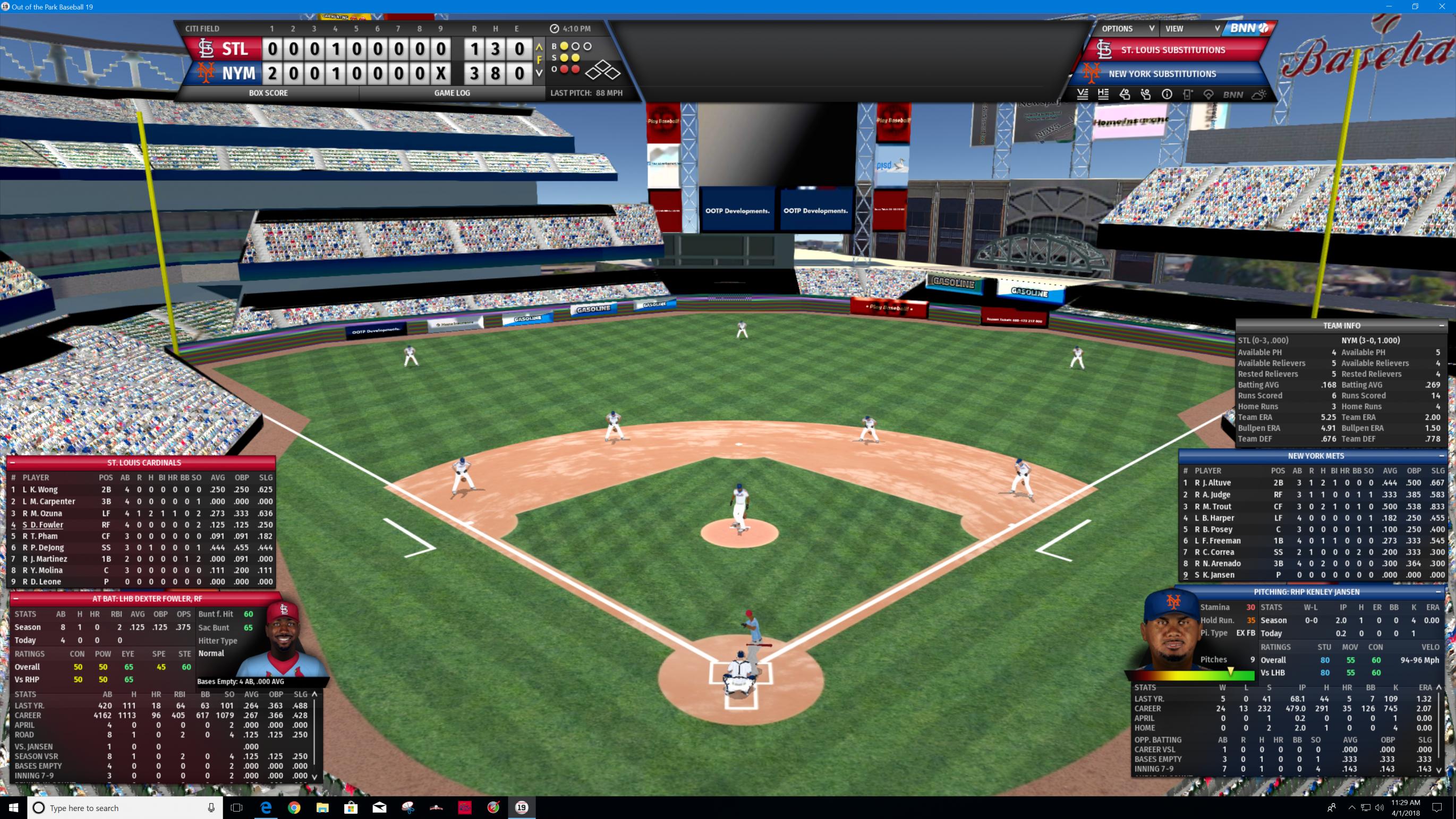 STL Cardinals 3 NY METS 5 STL Carlos Martinez pitched a gem, but after waking up, the Mets lineup grabs the Opening Day win. I thought the AI was going to win this game no matter what we did. For STL: Carlos Martinez had 9 Ks and the Mets had a lot of trouble finding ways to break through. Kolten Wong went 2-4 and hit a long HR(1) off of Syndergaard in the 5th. Paul DeJong was the main man for them as he went 3-4 today. For NYM: "Thor" did not have his best, but it was enough to get the win. He gave up 3 runs on 7 hits with 6 strikeouts to his credit. It was the lineup that won the game today. Freddie Freeman hit his 1st HR, a 3-run shot to put the Mets ahead in a 5-run 6th inning. Jose Altuve and Aaron Judge both had two hits today. The bullpen was strong as Kenley Jansen got his 1st save of the year. Starting off the season 1-0 is always sweet and special. We have the day off tomorrow! See you Saturday!