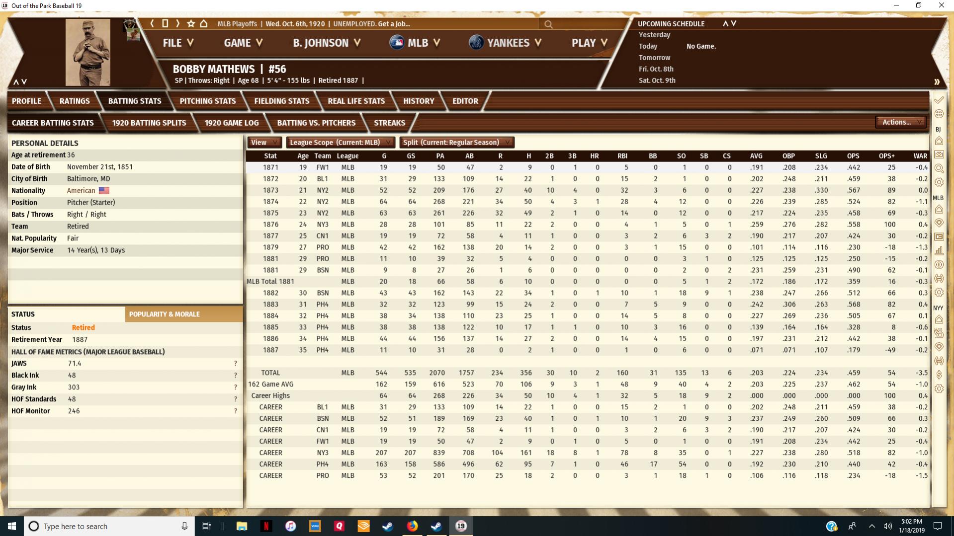 I have been helped so much by the community so i try to do the same. I will try to update when i complete this sim. I still cant believe i was able to sim from 1871-1920 in less than a month with the 19th century players playing on the correct teams. Here is an example. I think i got all Mathews teams correct. |