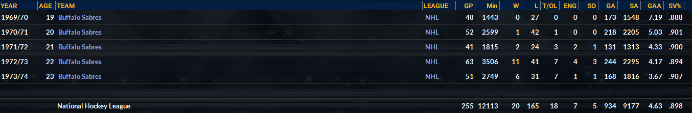 Dan Bouchard improved his GAA but his wins dropped below 10 again. Buffalo's record is equally sad and attendance is disastrous. |
