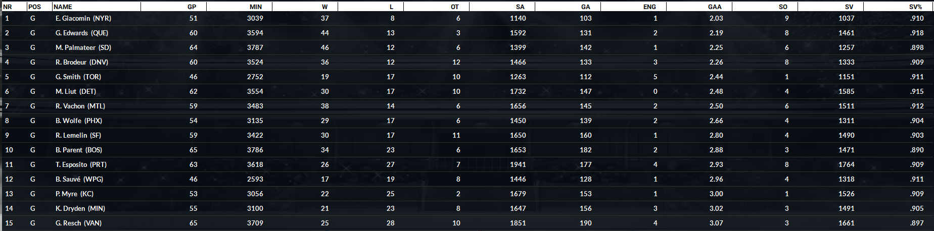 Rangers and Buffalo top their division in the East. Vancouver and Denver top their divisions in the West. But San Diego finished second to Denver with the 2nd highest point total. Ivan Boldirev of Denver once again leads the NHL in scoring with a record 160 points, beating Hull's old record of 142. Teammate and d-man Ron Greschner finishes 5th overall. Marcel Dionne and Rick Kehoe finish 2 and 3. Rookie Kent Nillson passed over by cities like Winnipeg and Atlanta in the draft, scores 108 points. He falls 1 point shy of Dionne's record 109. In the crease Denver's Brodeur finishes with a GAA of 1.81 and Sv% of .930. |