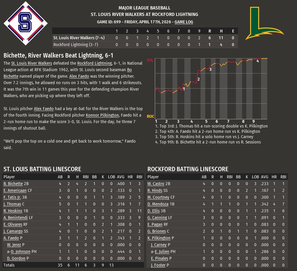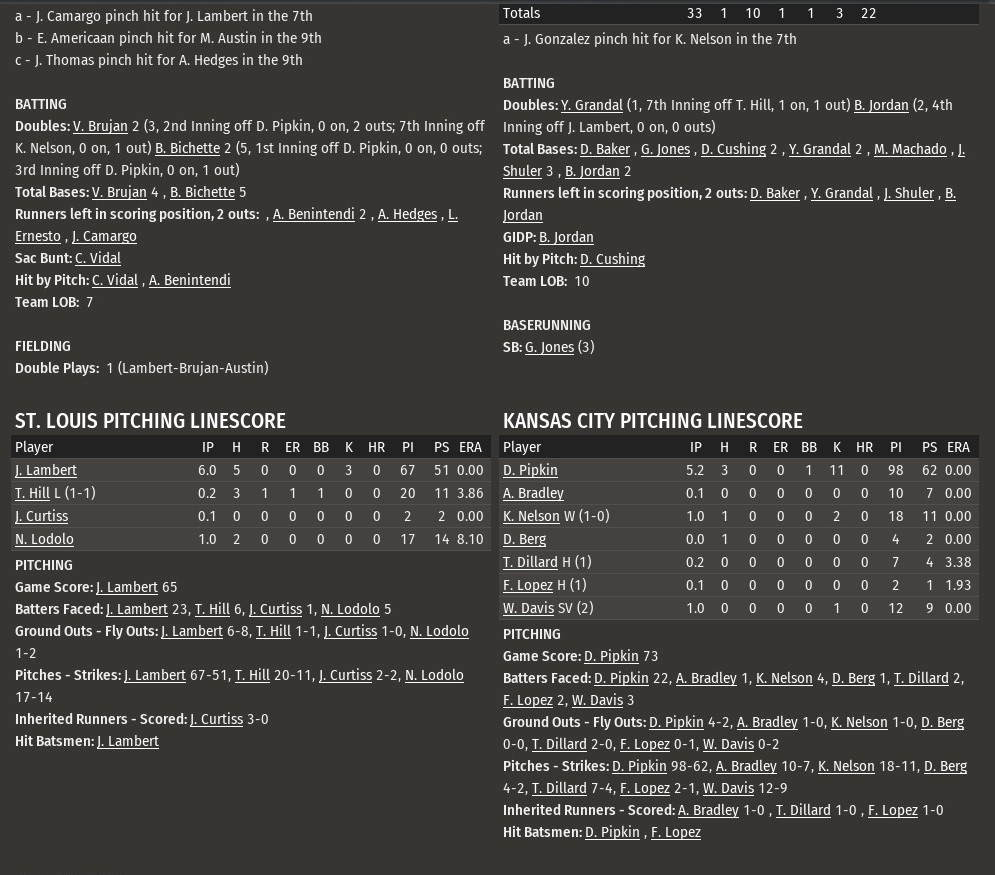 St. Louis jumped out to a 5-1 lead and then held off a late Twin Cities comeback to post a 7-4 win at the Metrodome (1996). The River Walkers took it to Snow Cats starting pitcher Joe Gallo right off the bat putting their first five batters on base to open the game while building a 3-0 lead. The inning also featured three hits and a pair of walks. Andrew Benintendi and Fernando Tatis Jr. drove in the first two runs with RBI singles. The third run scored when Jared Thomas hit into a double play for the first two outs of the game. St. Louis pushed it lead to 5-1 in the fifth. Reliever Mike Shawaryn walked the first two batters of the frame. Both runners then moved up when Will Banfield allowed a passed ball. Jean Carmona drove in the inning's first run with a sacrifice fly. Larry Ernesto chased the second with a single. Twin Cities climbed back to within 5-4, with a single run in the sixth (a homer from Mitch Bernier off St. Louis starter Jimmy Lambert) and two in the eighth (Josiah Miller with a two-run homer off Danny Grigg). But Andrew Benintendi got both those runs back with a two-run shot of his own in the top of the ninth off Bruce DeWett. Lambert (2-0) wasn't as impressive in this start, he had gone his first 12 innings of the season without allowing a run, but still got the job done allowing two runs on six hits over six innings. John Curtiss worked a scoreless seventh inning before Grigg allowed Miller's homer in the eighth., Two Twin Cities batters got on base against Edwin Diaz in the ninth, but he didn't allow run to earn his fourth save. |