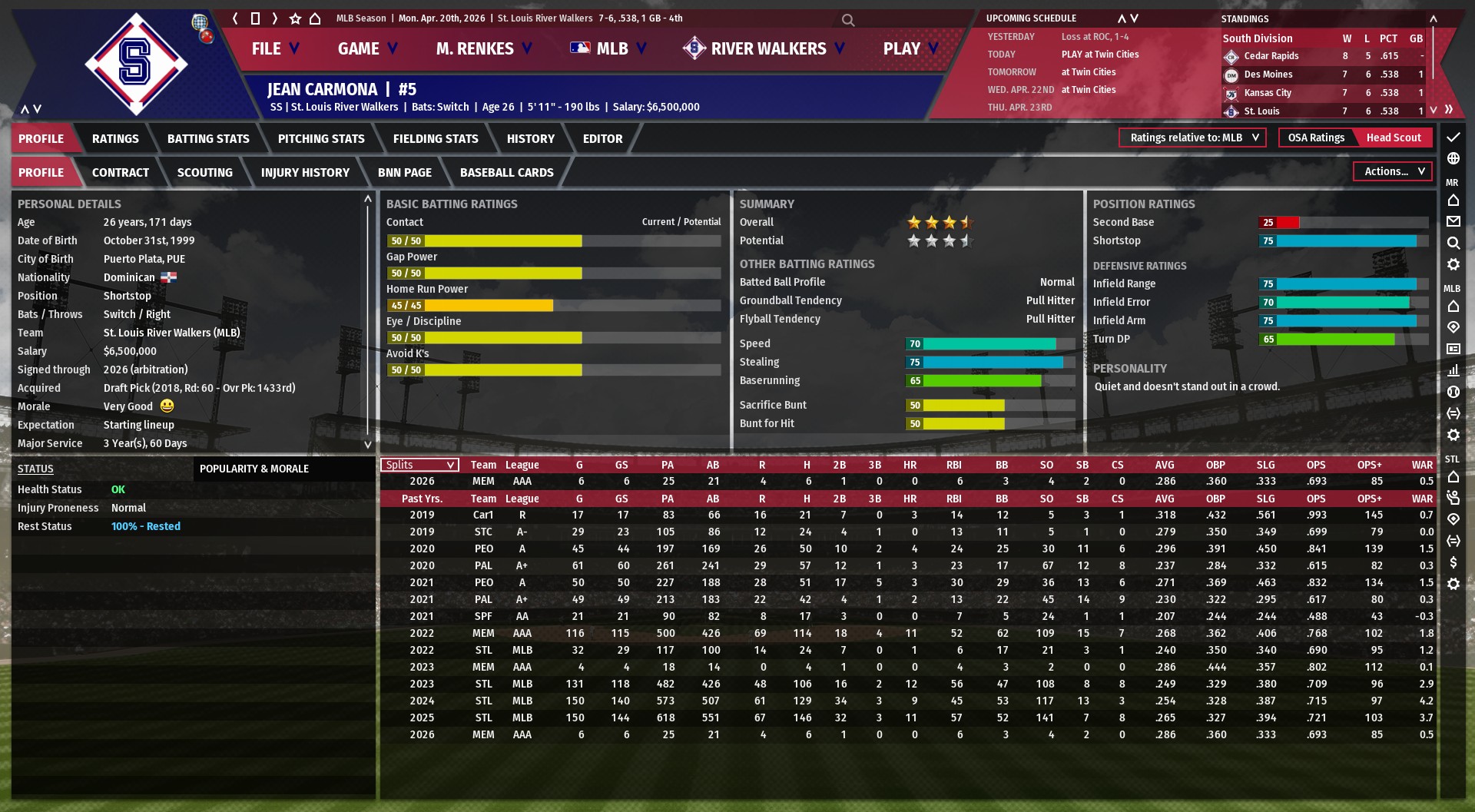 Shortstop Jean Carmona has been called up from AAA Memphis where he was on an injury rehab after suffering a knee injury during spring training. In six games at Memphis, Carmona had batted .256 with no homers and six RBIs. Heading down to the Redbirds will by third baseman Myles Austin. During his brief times in the major, Austin got into five games and batted .400 with a homer and three RBIs. In another move, the Walkers called up first baseman/third baseman JT Schwartz from the Redbirds. He's played 11 games at AAA this season, batting .354 with two homers and 10 RBIs. Heading down to the Redbirds will be outfielder Edwardo Oliveras. He got into seven games as a Walker, batting .308 with an RBI. |