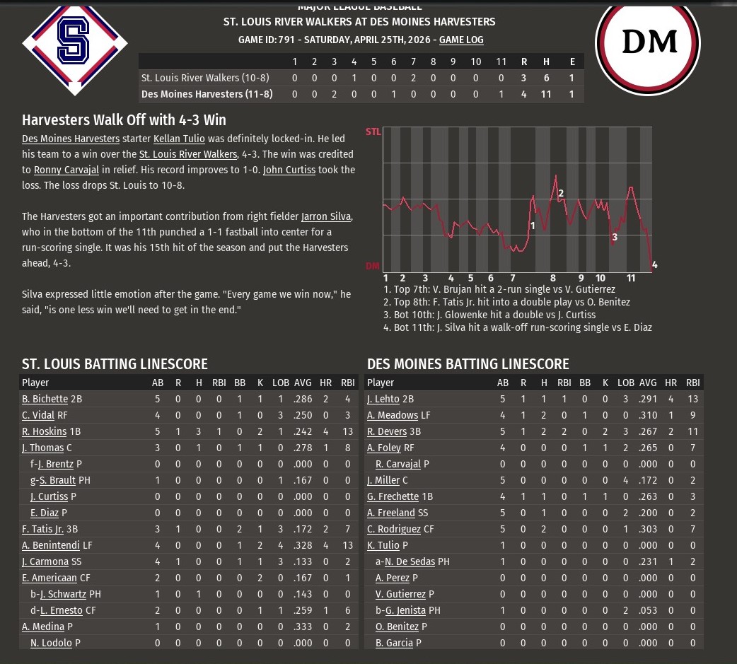 Jarron Silva connected on an RBI single off St. Louis closer Edwin Diaz with one out in the bottom of the 11th inning to lift Des Moines to a 4-3 win at LaBatt park. Garrett Frechette scored the run after he had led off the inning with a walk from River Walkers reliever John Curtiss. A ground out by Alex Freeland moved Frechette to second and brought Diaz into the game. Carlos David Robinson hit a chopped out in front of the plate that was botched by catcher Austin Hedges to put runners at the corners. Silva then drove a 1-1 pitch up the middle to score Frechette with the game winner. Down 3-1, St. Louis had tied with a pair of runs in the top of the seventh. Pinch-hitter Vidal Brujan plated them both with a single off reliever Vladimir Gutierrez. Harvesters starting pitcher Kellan Tulio lasted five innings, allowing one run on two hits. He struck out seven and walked none. Seven relievers -- Andrew Perez (1.0 IP), Gutierrez (1.0), Omar Benitez (1.0), Bryan Garcia (2.0), Addison Reed (0.1) and Ronny Carvajal (0.2) -- followed him to the mound. Carvajal (1-0) walked away with his first win of the season. |
