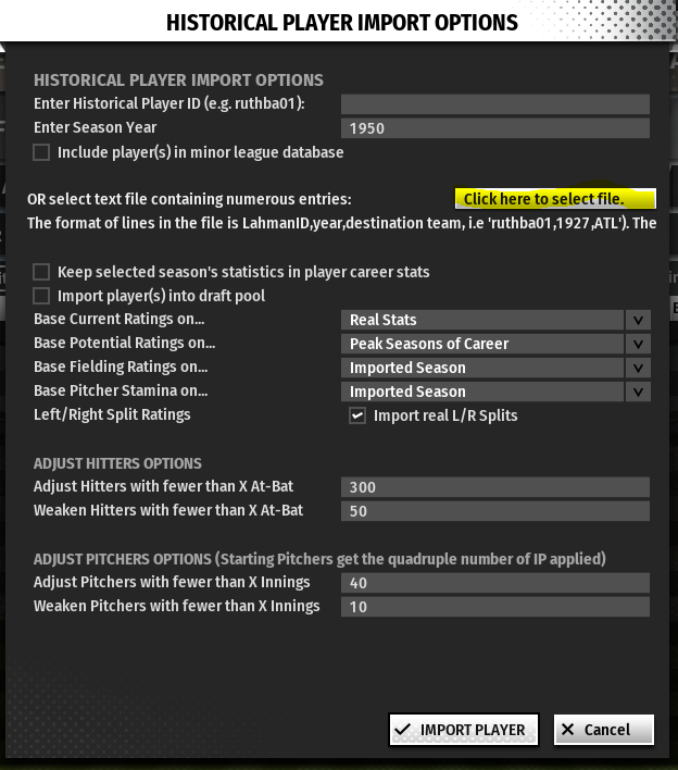 No success yet, even with trying to import a single player from a Spritze-related database with the ID code abercda01 and the year 1871, for example, unfortunately. This is rather perplexing, to say the least. There's got to be a way I can get the players I want into the game's relevant draft pool, right? CD out.