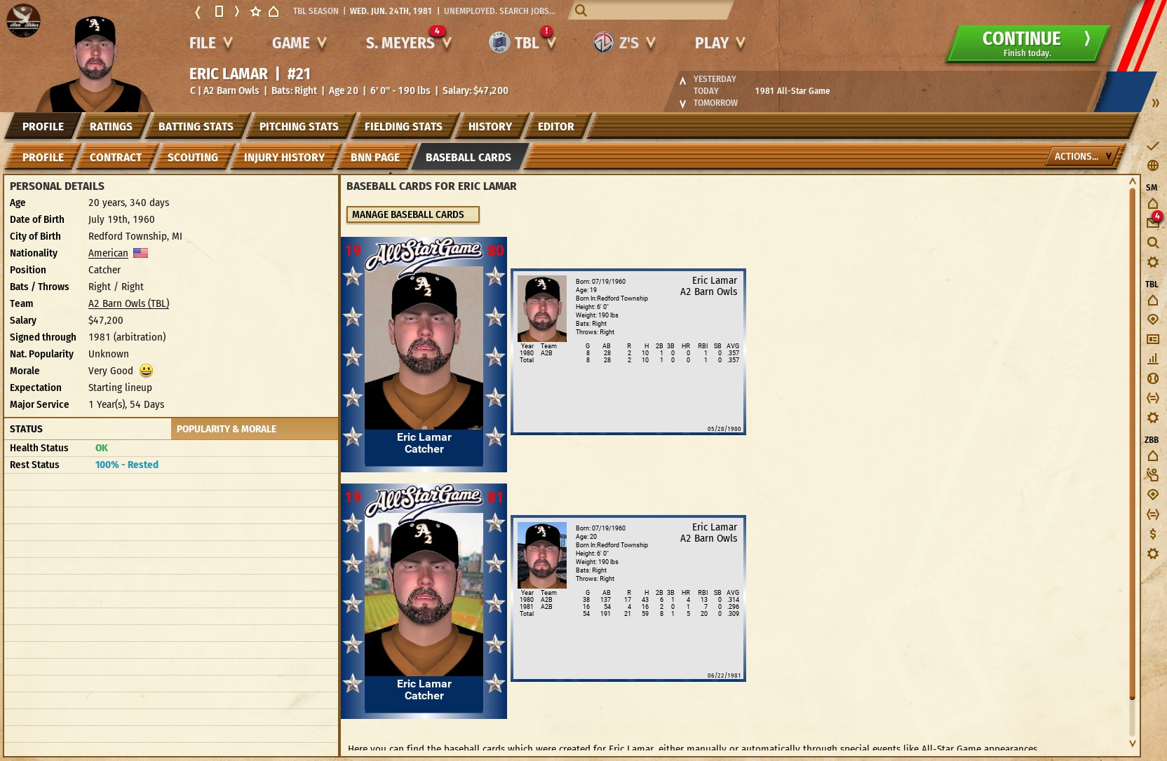 Phil Stoke seems to defy his age, and his ratings. He's 36, owns TWO pitches, has mediocre stamina, and does not have what you would call highly rated intangibles. Yet, he manages to have an off the charts 20-1 career record.