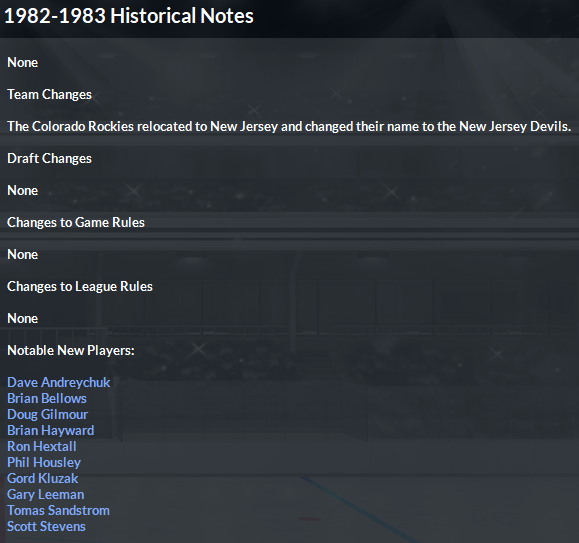 I'm playing this series on 2 different computers, so in transferring back and forth sometimes I forget to take screenshots and miss stuff. When in doubt I just forge ahead. Anyway, in this season's playoffs, the Montreal Canadiens went all the way and defeated the Edmonton Oilers in Game 7 of the 1983 Stanley Cup Finals. Gretzky and the Oilers were up 2-1 and 3-2 in the series, but failed to close out the well-rounded Habs. That's 2 straight seasons with Adams Division champions raising the Cup. The Oilers still have to wait for their first. For end of season awards, I think we only had Brian Propp getting 2nd Team All-Star at LW. As the season rolls over, we have the Colorado Rockies moving to New Jersey to become the Devils, and there will finally be some stability in the NHL teams until the 90s expansion. Although 21 teams is kind of an odd number, I do like this era of the NHL... no team feels out of place in their division or in the league. In more interesting news, Don Cherry is named the coach of the Maple Leafs which I'm sure is a dream come true for him! Last edited by Argonaut; 07-28-2020 at 04:55 PM. |