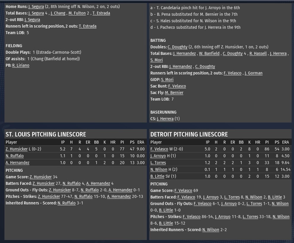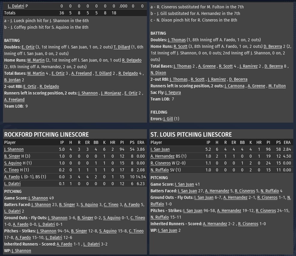 Leading 2-1, Madison chased St. Louis starting pitcher Zack Hunsicker with four runs in the bottom of the third, and the Muskies went on for a 6-2 win at Comiskey Park (1991). Former River Walkers third baseman Jordan Groshans put the Muskies on top when he led off the bottom of the second inning with a solo homer off Hunsicker. Groshans, who hit 43 homers and drove in 106 runs for St. Louis in 2031 only to leave the team in free agency, agreed on a one-year deal with Madison worth $2.84 million on April 9. Pitcher Bryce Osmand singled and scored in the third, Yan Dixon sending him home with a fly out. With the score now 2-1, Jose Ramirez led off the fourth with a homer off Osmond, the fourth spelt the end for Hunsicker. Madison scored four runs on four hits, and were helped by a wild pitch and an error by third baseman Matt Fulton. Osmond supplied the biggest hit, with a two-run double. Dixon collected another RBI with a single. In addition to going 2 for 2 at the plate, with two runs scored and a pair of RBIs, Osmond (1-0) allowed one run on three hits over the firsrt six innings. He struck out four and didn't issues a walk. The rest of the game belonged to Johnny Kuhn Jr. (2.0 IP) and former Walkers pitcher Ben Schellenger (1.0), who combined to close out the win. |