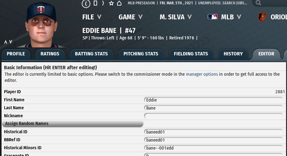 I'm currently checking leagues for all of the player name facegens files and getting rid of dupes and transforming the names to historical ID where possible. I started a real world game with every league possible so I can check each name. I was going down the list and I came across Eddie Bane. There is only one Eddie Bane, a historical player which I know I had already done all historical players, so I checked his historical ID in the standard game: bane--001edd and went to cross check with my Historical MLB folder and I did not find a match.I then opened my 1975 league andI found eddie bane whose historical ID looked like this bane--001edw What gives? Why two different IDs based on game type? I really hope this is an exception. anyone else come across this before? Also, the fact they are two different pictures is not lost on me, but the database is what concerns me more Not sure why the same player