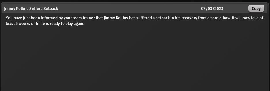 JR lowered my payroll. Many of his goals I won't accomplish. SS Jimmy Rollins, 1b Adam LaRoche & P Jerry Reuss retired.
