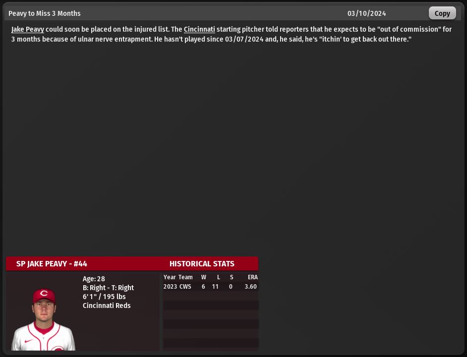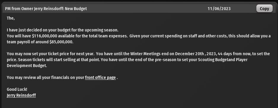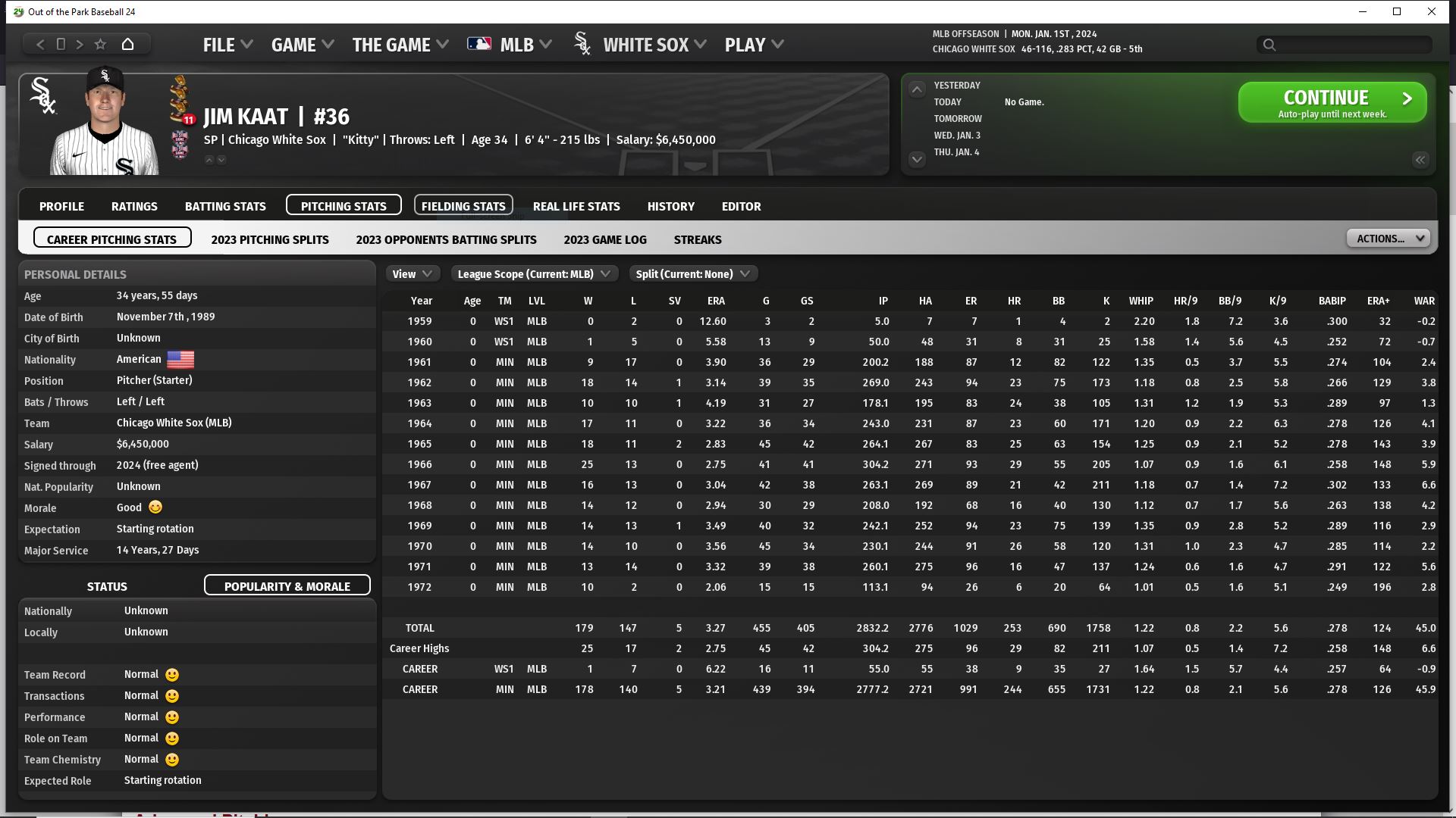 I would say i pmroved the rotation drastically over 2023. Seaver, Wynn, Perez & Kaat should be a lot better then Peavy, Colon, Shields & Navarro. Wilhelm is an upgrade over Kimbrel but the rest of the pen is bad. offensively we might have less power then last season but more depth and more players hit for higher AVG.