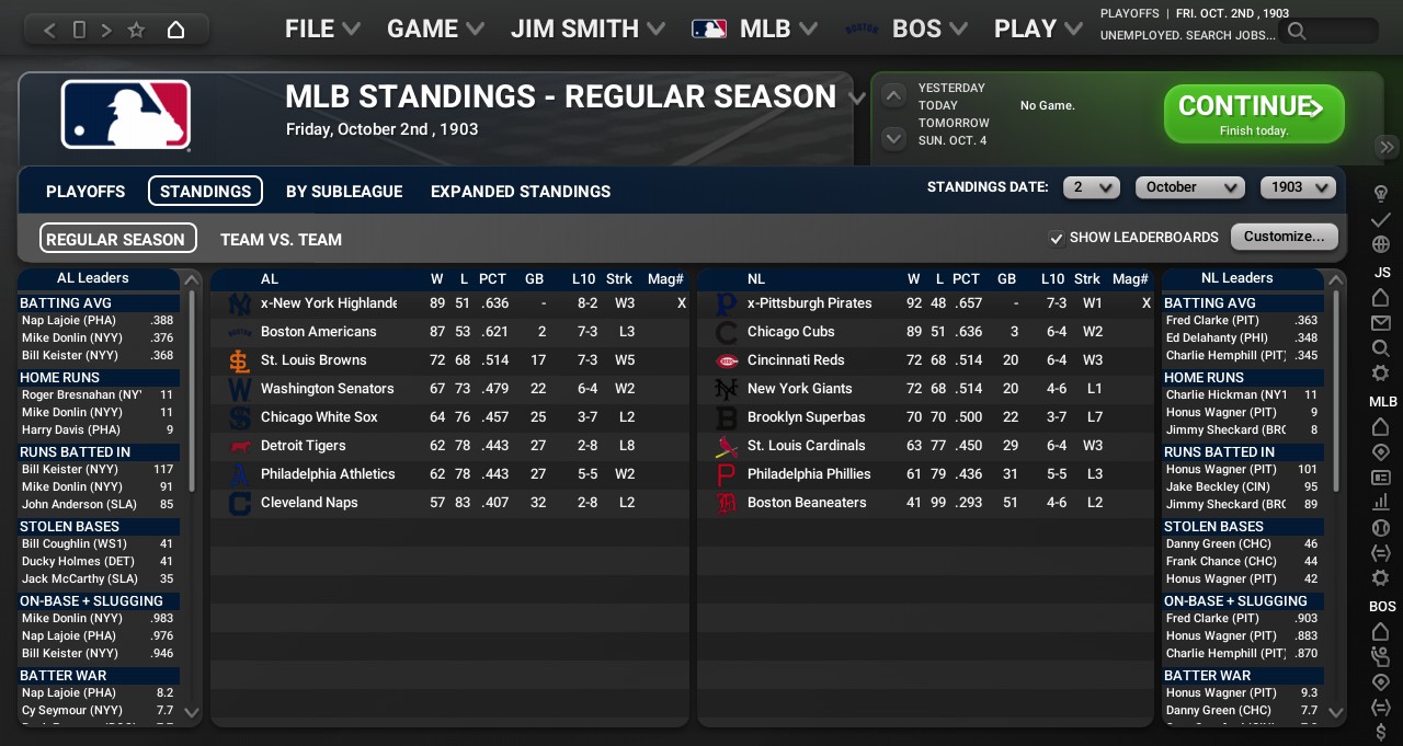 -AL Best Batter award: 2B Nap Lajole of the Philadelphia Athletics with 3 home runs, 77 RBIs, and 83 runs scored. -NL Best Batter award: LF Fred Clarke of the Pittsburgh Pirates with 3 home runs, 87 RBIs, and 83 runs scored. -NL Triple Crown winner: SP Rube Waddell of the Pittsburgh Pirates with a 26-9 record, a 1.73 ERA, and 281 strikeouts. Awards for September: LF Mike Donlin of the New York Highlanders wins the AL Batter of the Month Award. LF Jesse Burkett of the St. Louis Cardinals wins the NL Batter of the Month Award. SP Watty Lee of the Washington Senators wins the AL Pitcher of the Month Award. SP Addie Joss of the Chicago Cubs wins the NL Pitcher of the Month Award. SP Cy Falkenberg of the Chicago White Sox wins the AL Rookie of the Month Award. SP Jack Pfiester of the New York Giants wins the NL Rookie of the Month Award. For the World Series, it is officially the first rematch in World Series history: the New York Highlanders (89-51) vs. the Pittsburgh Pirates (92-48)!!! Last edited by Lord Byron; 02-11-2024 at 12:22 AM. |