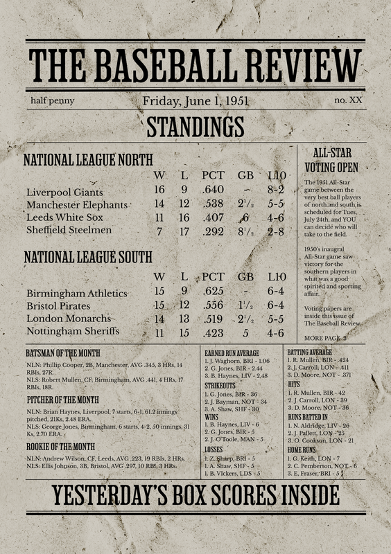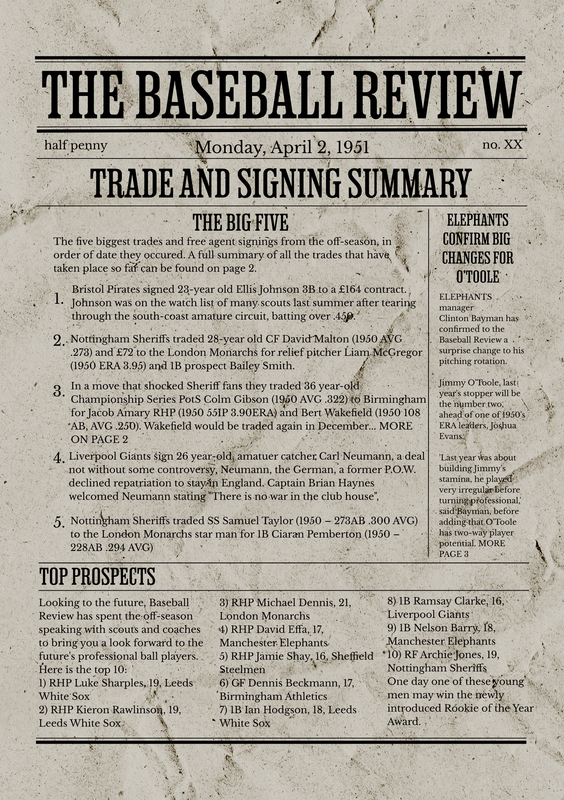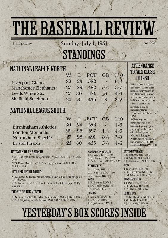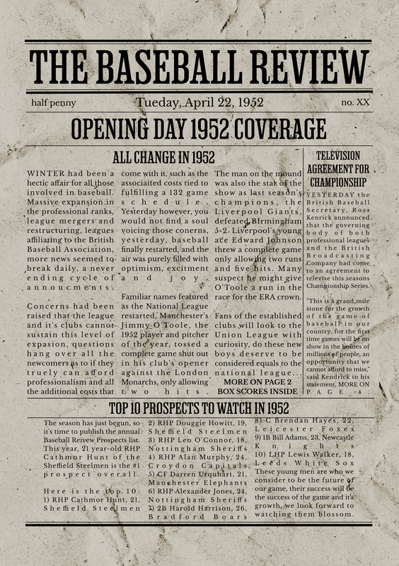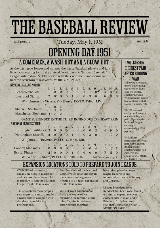 Opening Day 1951 A Comeback, a wash-out and a blow-out Tuesday, May 1, 1951As the days grow longer and warmer the day all baseball players and fans have been waiting for finally arrived. Yesterday the National Baseball League ushered in the 1951 season with the excitement and drama we became accustom to last year. In Liverpool the lead was back and forth throughout the game. Leeds White Sox took the lead in the top of the 1st, a 2-run home run from Jack Kennedy gave the Giants the lead in the bottom half. After adding a run to this lead in the 5th, Leeds pulled back 2 in the 7th and 1 in the 8th to lead the game 4-3. 3 runs in the bottom of the 8th, assisted by an error from the Leeds defence was enough for the Giants to win 4-6. Over 6,000 flooded into Belle Vue Stadium for opening day in Manchester and heavy rain flooded the field... Not before a good 3 innings of action though, a double from Jack Findlay was followed shortly after by a double from Phil Cooper to open the scoring for the Elephants. A sacrifice fly-ball from the bat of Scanlon Ellis of the Steelmen saw the game tied as the umpires called it a day in the 3rd. The game will resume today (Tuesday 1st), weather permitting. In Nottingham it was an assured defensive performance that limited the Sheriffs to 1 run, despite racking up 10 hits. Athletics pitching ace George Jones took the win and Player of the Game plaudits, throwing the whole game only allowing the 1 run despite 10 hits, and sitting down the Nottingham batters swinging 5 times. Two solo home-runs in the top of the 9th secured a comfortable win for the London Monarchs. Bristol opened solidly with an error in their favour and 4 singles to take a 2 run lead in the 1st. However the Pirates had no answer to Gael Keith's bat, he tallied 2 runs, 3 hits, 1 RBI, and 1 base on balls in his 5 plate apperances. ![]() From the Baseball Review's archive |