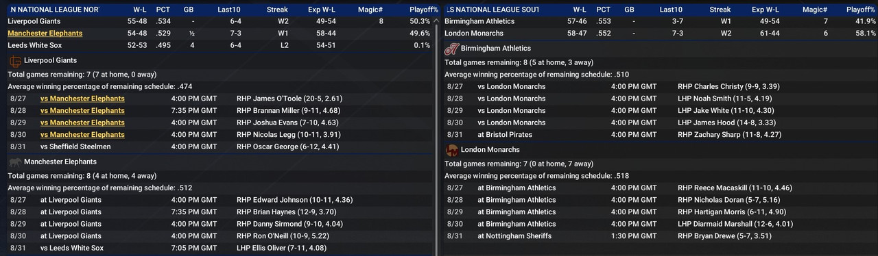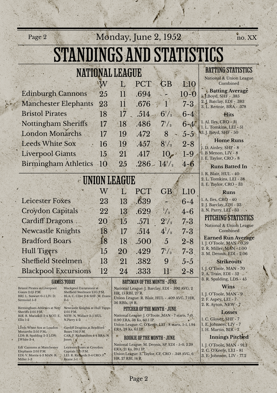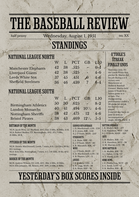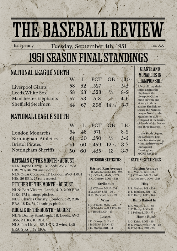 The Baseball Review The 1951 Pennant Chase Monday, August 27, 1951. As we enter the final week of this 1951 baseball season the chase for the National League North and South Pennants could not be any closer. In the North, with the season on the line, Manchester Elephants are to travel to Liverpool's Sefton Park for a 4 game set, the Manchester club are half a game back on the Giants with a total of 8 ballgames remaining to play. The Elephants will go on to face the Leeds White Sox in their final 4 games at their Belle Vue Stadium, whilst the Giants have 3 remaining at their home against last season's National League North winners' the Sheffield Steelmen. Down in the National League South the Birmingham Athletics sit top with a 57-46 record followed by the London Monarchs on a 58-47 record respectively. The Monarchs will travel to Birmingham for a series of 4 games that could decide the pennant, they follow this with a 3 game set in Nottingham. The Athletics will wrap up their season with a 3 game set in Bristol. The Monarchs fantastic form of 7 wins in their last 10 has them as favourites in the South, whilst bookmakers see the North league as almost too close to call.