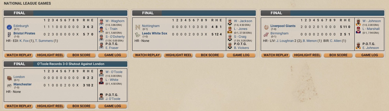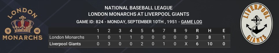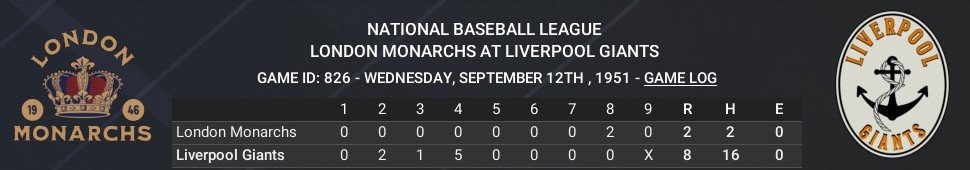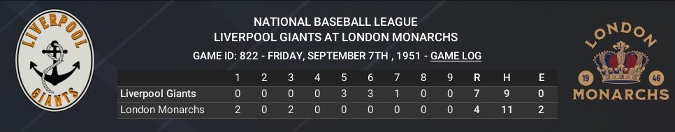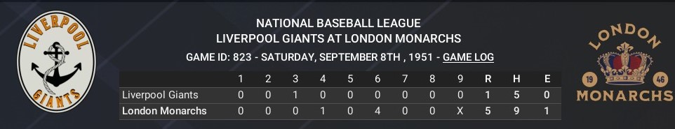The regular season had wrapped up in an incredible fashion. Baseball had spread like a fever in London as their Monarchs mounted an incredible run to take the National League South pennant. On the 1st of August the London club was 10 games behind the Birmingham Athletics, a run of 24 victories in 31 games would see the Monarchs take the pennant, 2 and a half games ahead. An run of good form so notable, the comeback would still be talked about in modern times as one of the greatest. In the North League the complete collapse of Sheffield Steelmen, last year’s pennant winners, finishing with a record of 44-67, created the novel circumstance where the 1951 standings were the exact opposite of 1950. The Giants turnaround had been impressive, but not a certainty, out of all 8 teams combined the Liverpool club sat average in both offence and defence, they had not been stand out in any area, but their consistency had carried them to the northern pennant, they were going into the Championship Series without pressure, as outsiders. ![]() Game 1; a 1 on, 1 out, home run from Monarchs’ star man Oscar Cookson, in the bottom of the first got the scoring open for the series. London added two more in the third, but a defensive and pitching collapse in the fifth and sixth allowed the Giants victory. Jack White was on the mound for the Monarchs, formerly of the Giants. In 5.2 innings he allowed 7 hits, 6 runs, 3 earned runs. The game was really about his former comrade in arms, Liverpool pitcher Edward Johnson, although giving up 4 early runs, Johnson pitched the complete game, fanning 5 hitters along the way. But it was his performance at the bat that really caught the eye, in 4 at bats, he got 2 hits and 2 RBIs for his efforts, playing his part in the Liverpool comeback. Player of the Game: Edward Johnson, Liverpool Giants ![]() Game 2; Cove, Cookson and Keith, came to life. A run in the batting order that had been terrifying the South League for a month were asleep in game one, but their bats cracked in game 2. In the top of the third the Giants took a 1 run lead, a Keith solo-home run in the fourth tied it up. 4 more for the Monarchs in the sixth, with a two-run home run from Cookson, gave the Monarchs a comfortable 1-5 victory, to the delight of the expecting London fans. There were some whispers of concern however, the fifth man in London’s deadly order, right fielder Pallett had an average of .307 for the regular season with 77 RBIs. He’d been hitless so far in the series. Player of the Game: Gael Keith, London Monarchs ![]() Game 3; the Monarchs travelled to Liverpool with the series tied. Cookson opened the scoring with a solo-home run, his third home run in three games. The Giants put up 3 in the second but inning by inning the Monarchs clawed back runs, with the game tied in the fifth, Liverpool favourite Kennedy hit a 2 run-home run to give the Giants a lead they would not give up this time. Another run in the seventh and a solid showing from Liverpool’s relief pitchers, Wiles and D’Arcy secured a 3-6 victory and have the Liverpool club a 2-1 lead in the series. Player of the Game: James Walker, Liverpool ![]() Game 4; double, double, double. Liverpool’s James Walker in 5 at bats, got 3 hits, all of which were doubles, to do his part in securing a third win in the series for the Giants. The Liverpool club took the lead in the second and did not look back, a solo-home run from second-baseman Duncan added to the lead. London’s Keith hit a solo-home run in the fourth, which would be a solitary consolation. Liverpool continued to add to their lead in the fifth, and sixth. A 3 run-home run Liverpool’s right fielder, Jude Loughran, secured a 1-7 win for the Giants. Player of the Game: Edward Johnson Walker’s 3 doubles sets the record for doubles in a play of game. ![]() Game 5; Liverpool pitcher Brian Haynes, put on quite the up and down display, he allowed 10 walks, but only 2 hits, London failing to make him pay for his poor control. The Championship was all but confirmed to be Liverpool’s by the fifth inning, as they scored 2 in the second, 1 in the third and 5 in the fourth, with no answer from London until the eighth. After the final out, the sellout crowd in Sefton Park erupted into the field to celebrate with their heroes. Player of the Game: Nicky Aldridge, Liverpool. Brian Haynes sets playoff record for walks allowed with 10. Liverpool Giants win series, 4 to 1. ![]() Player of the Series: James Walker, LF, Liverpool Giants. |